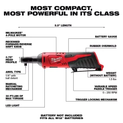 This limited time combo kits includes both M12 12-Volt lithium-ion cordless 1/4 in. ratchet and 3/8 in. ratchets. Includes 2 2.0Ah M12 batteries and a charger. Choose the sub-compact ratchet with best-in-class power, speed and durability. The M12 Cordless 1/4 in. and 3/8 in. Lithium-Ion Ratchet is the ideal tool for auto mechanics, maintenance and repair professionals looking for maximum performance and productivity in a subcompact cordless tool. It utilizes a powerful 12-Volt motor to produce up to 30 ft./lbs. of torque and 250 RPM, giving users the power and speed of a pneumatic ratchet without the air hose.