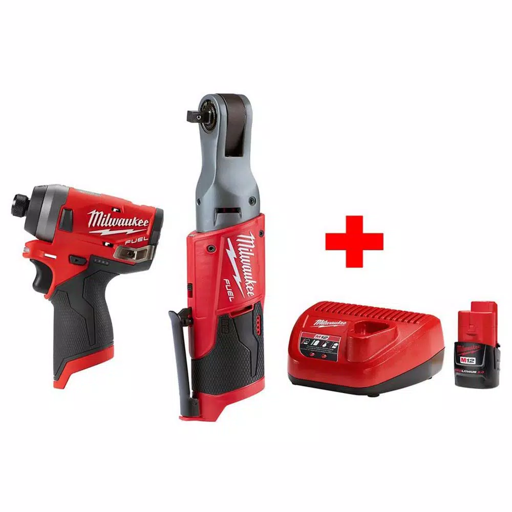 - Includes: M12 FUEL 3/8 in. ratchet (2557-20), M12 FUEL 1/4 in. hex impact driver (2553-20), M12 compact battery 2.0Ah and charger starter kit (48-59-2420)