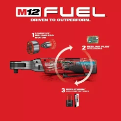 The MILWAUKEE M12 FUEL 3/8 in. Ratchet is the first cordless tool that provides both the torque and compact size to replace pneumatic ratchets in the industry. This cordless ratchet has up to 55ft-lbs of max torque and 200 RPM making it the ideal fastening solution for automotive mechanics, repair technicians and maintenance workers who demand maximum performance and convenient portability. The M12 battery powered ratchet has a low profile head and cordless design which allows users more access in tight spaces than competitive units. With the industry leading FUEL technology, a reinforced mechanism and investment cast steel yoke housing, this rechargeable ratchet can withstand daily jobsite wear and tear for years of reliable use. Milwaukeeโs cordless ratchet has eliminated the constant maintenance of pneumatic ratchets and the nuisance of an air hose in the shop. The M12 FUEL Ratchet delivers the maximum portability and productivity for the professional user. In addition to the M12 FUEL Ratchet, this kit includes 2 batteries, charger and carrying case.
