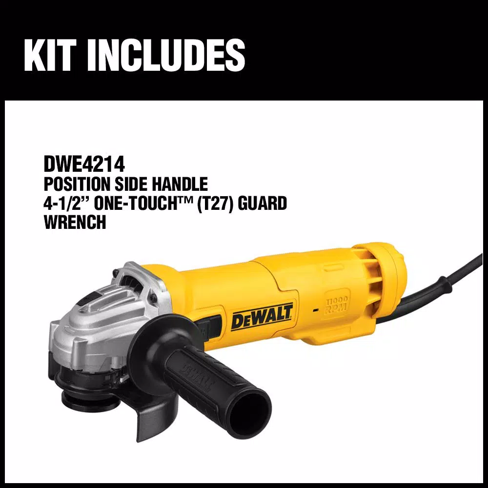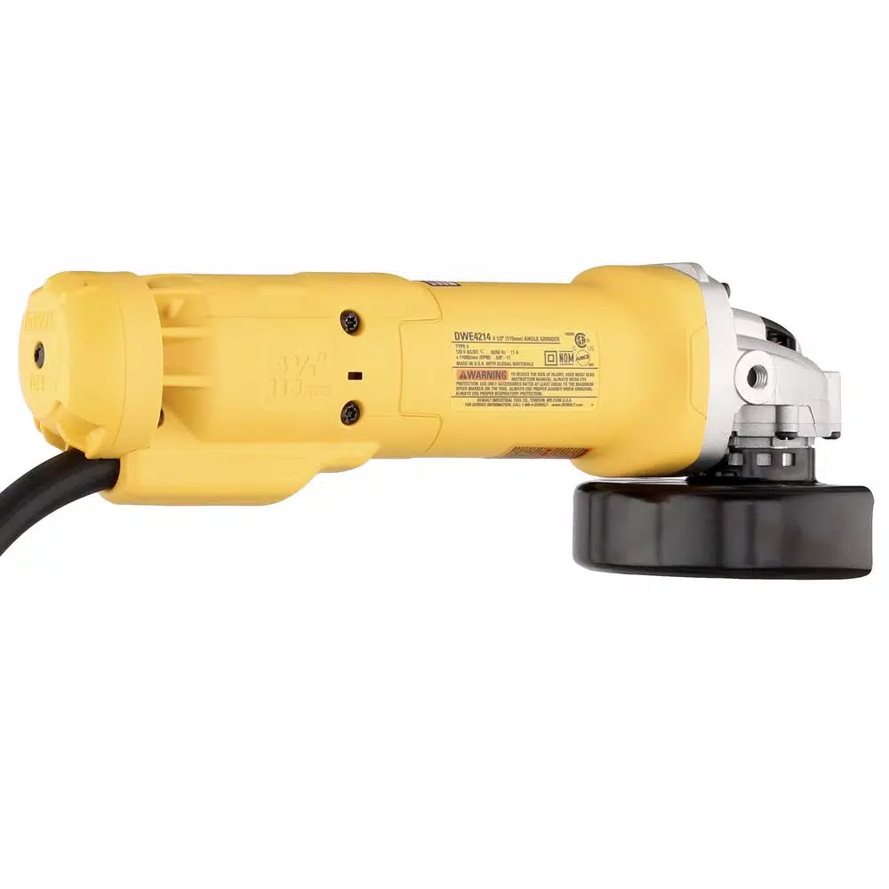 The DWE4214 4-1/2 in. (115 mm) Small Angle Grinder features 3-powerful systems for maximizing performance such as the Dust Ejection System for preventing damaging dust from entering the tool. One-Touch Guard allows for 360Β° rotations. The Quick-Change Wheel Release id designed for easy wheel removal.