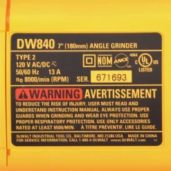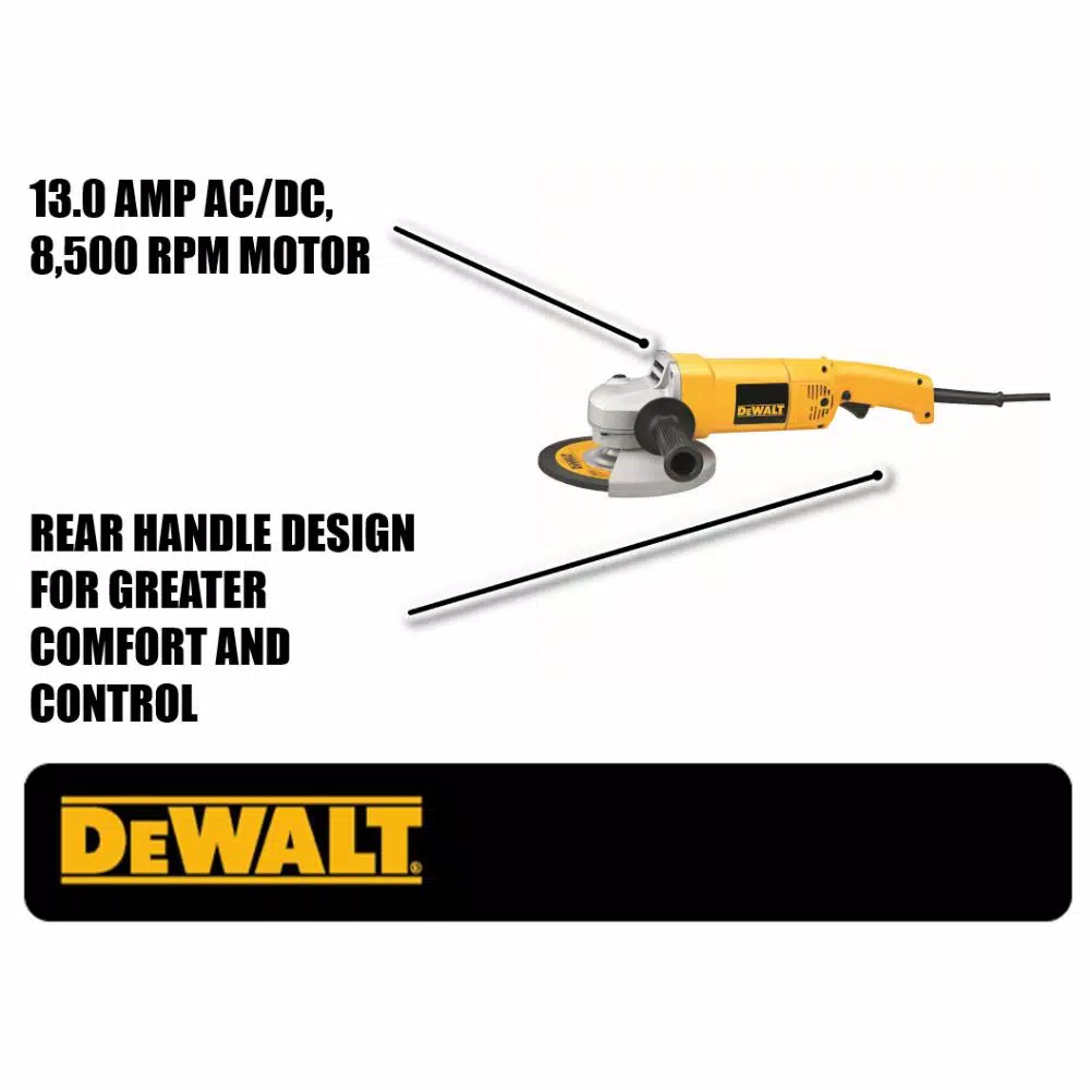 High-powered and accurate, the DEWALT 7 in. Heavy Duty Angle Grinder with Bag and Wheels has a 13 Amp, AC/DC, 8000 RPM motor to handle your 7 in. grinding applications with ease. Featuring a keyless, adjustable guard for convenient and easy tool-free adjustments, this grinder has a rear handle design for added comfort and better control. The brush caps are external for easy servicing and the sealed ball and roller bearings help extend motor life. Lightweight and easily portable, this angle grinder has a high-power-to-weight ratio to provide you with greater efficiency and less user fatigue.