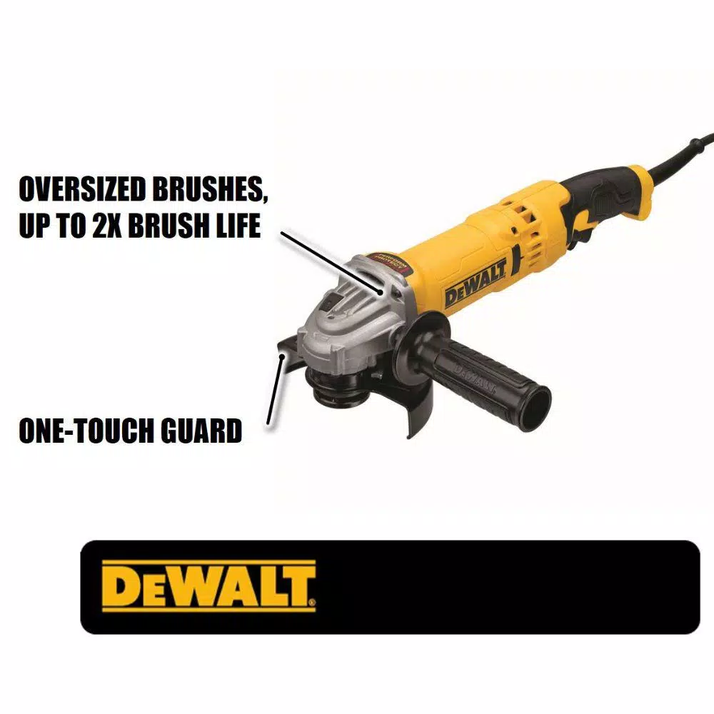 The DWE43113 4-1/2 in. / 5 in. High Performance Grinder with Trigger Grip is powered by a 13 Amp motor. This grinder is equipped with the Dust Ejection System technology designed to protect the tool from damaging dust and debris that enters through air intake vents. Backed by DEWALTβs Guaranteed Tough warranty for added peace of mind.