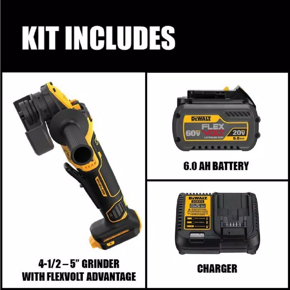 Take advantage of more power with our 20V MAX* brushless tools with FLEXVOLT ADVANTAGE tool technology. The Grinder has up to 54% more power when paired with a DCB606 FLEXVOLT battery vs. a DCB205 20V MAX* battery. The brushless motor delivers 1,550 max watts out and up to 9,000 rpm. This Grinder is part of our PERFORM & PROTECT product line with Kickback Brake and E-CLUTCH System. Battery and charger sold separately.