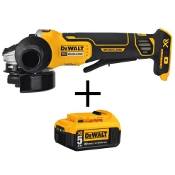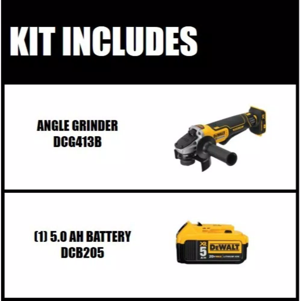 The 20-Volt MAX XR Angle Grinder features a brake, E-Clutch System and Kickback Brake. The brake quickly brings the wheel to a stop in 2-seconds or less when the trigger is released. The E-Clutch System automatically shuts down the motor when a wheel pinch in detected. These 2 features working together to shut the tool down without user interaction, called the Kickback Brake. Additionally, the grinder features a One-Touch Guard, which allows for single-action adjustments to change guard position. Keep your DEWALT 20-Volt tools running longer with the 20-Volt MAX Lithium-Ion Premium Battery Pack (DCB205). This battery is compatible with the complete line of DEWALT 20-Volt MAX tools. This battery is backed by a DEWALT 90-day money-back guarantee and 3-year free service contract for added peace of mind.
