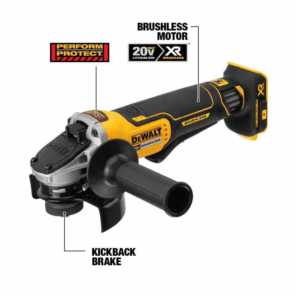 The 20-Volt MAX XR Angle Grinder features a brake, E-Clutch System, and Kickback Brake. The brake quickly brings the wheel to a stop in two seconds or less when the trigger is released. The E-Clutch System automatically shuts down the motor when a wheel pinch in detected. These two features working together to shut the tool down without user interaction, called the Kickback Brake. Additionally, the grinder features a One-Touch Guard, which allows for single-action adjustments to change guard position.