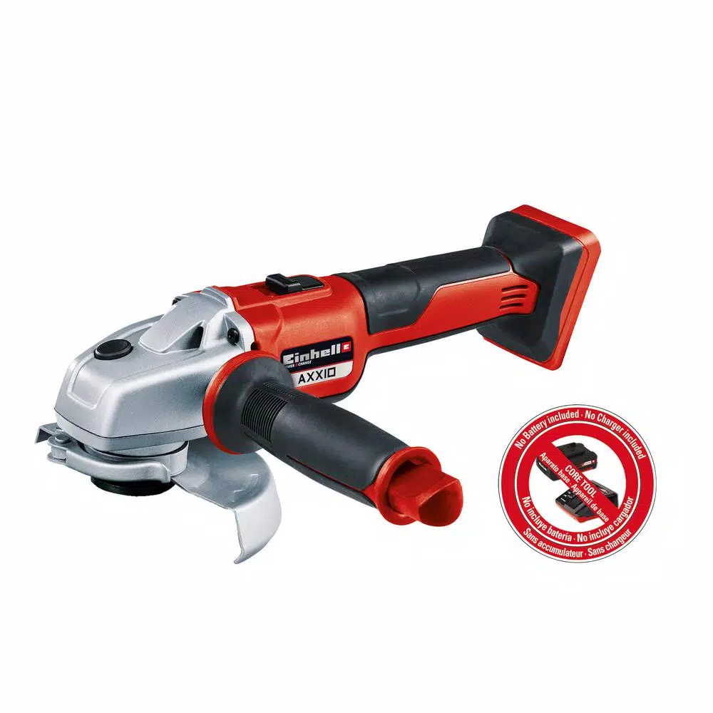 The Einhell cordless angle grinder AXXIO is the lightest brushless angle grinder in its class and features a high quality aluminum gearing housing. It is a member of the Power X-Change family, so the high-grade lithium-ion batteries can be used for all members of the Power X-Change family. The battery and charger are available separately. For optimal cutting and grinding results it is recommended that a 2.6 Ah Plus battery or higher is used. Softstart function and restart safeguard allow for the user to remain safe when in use. With its streamline design and ergonomic soft grip and the additional handle which can be fitted in 3 available positions, the tool offers comfortable handling. The modified air guidance ensures optimal cooling of the tool and minimizes strain on the gearing during operation. The disc guard comes with a quick-adjust fastener which can be adapted with just a twist of the hand to any task. An overload cut-off contributes to greater safety and a longer service life. Cutting disc not supplied.