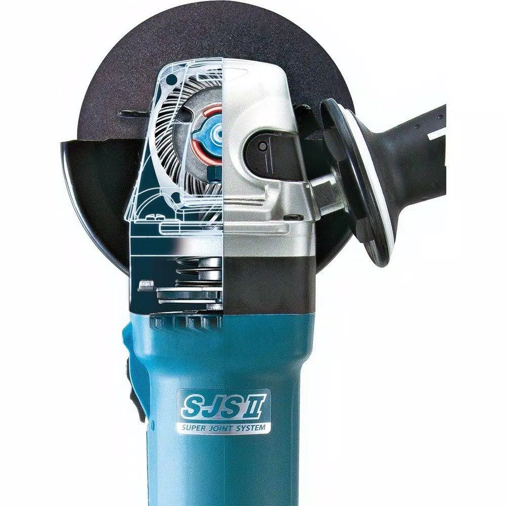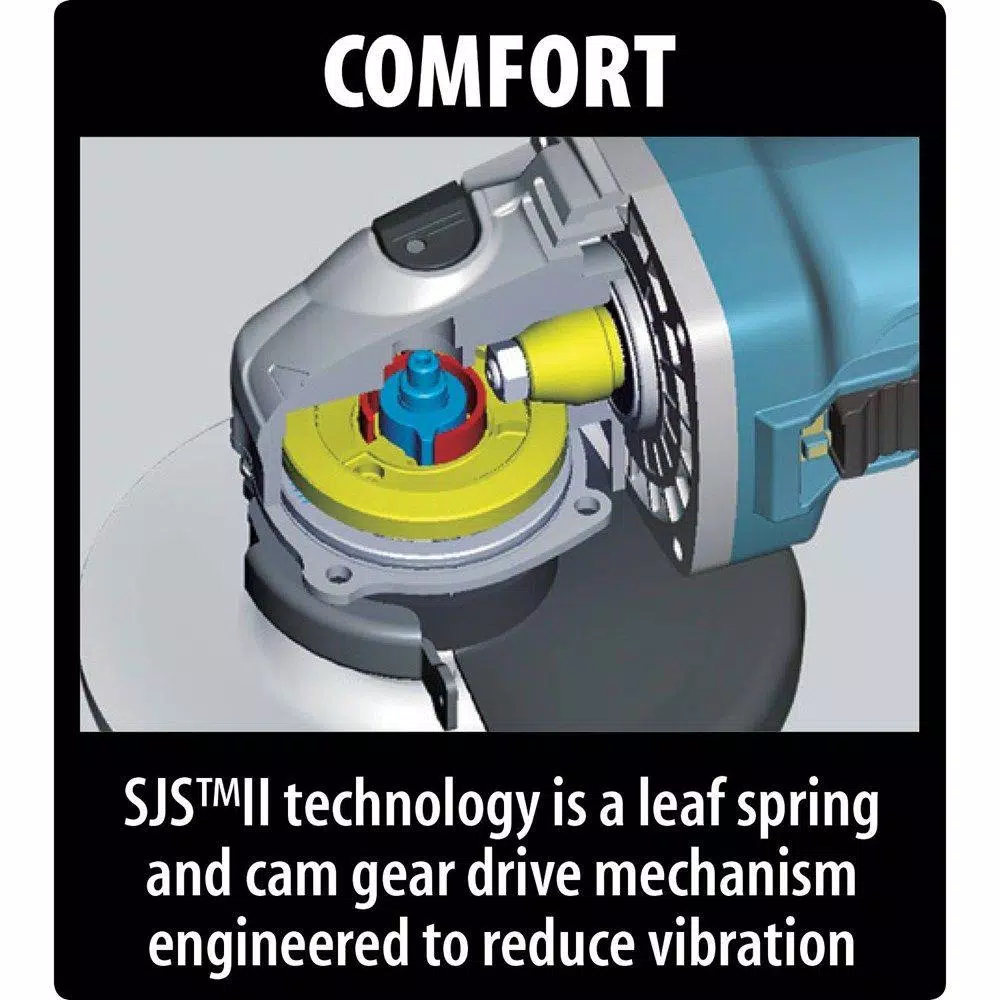 The Makita 5 in. SJS II High Power Angle Grinder (GA5042C) combines power, convenience, comfort and motor-protection features for longer-lasting industrial performance. It is ideal for cutting, grinding ferrous metal, paint and rust removal, shipyard maintenance, metal polishing, general steel grinding, auto repair work, cutting brick and masonry, restoration work and more. The GA5042C is equipped with SJS II, a mechanical gear drive system to help prevent motor and gear damage by dampening the force on the gear when the wheel is forced to stop. SJS II is also features a leaf spring and cam gear drive mechanism that is engineered to reduce vibration for increased operator comfort during extended use. The 12 Amp motor delivers 2,800-11,000 RPM for versatility and maximum productivity. Labyrinth construction protects the motor with a complex set of channels, prohibiting dust and contamination from entering the motor. Additional protection features include a Zig-zag epoxy applied to both sides of the armature coil and a powder-coating to the field. This forms a barrier under rotation and is engineered to protect from dust and debris penetration for longer tool life.
