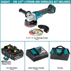 Makita delivers corded grinding performance without the cord with the 18-Volt LXT lithium-ion brushless 4-1/2 in. / 5 in. Cut-off/angle grinder Kit. Itโs powered by a Makita brushless motor for longer run time, increased power and speed and longer tool life. For the most demanding applications, Makitaโs exclusive automatic speed change technology automatically adjusts speed and torque during operation for optimal performance. The XAG04T is ideal for grinding, cutting and sanding a wide range of materials including tile, concrete, pipe, conduit and more. Itโs part of Makitaโs expanding 18-Volt lithium-ion system, the worldโs largest cordless tool system powered by 18-Volt lithium-ion slide-style batteries. Makita 18-Volt lithium-ion batteries have the fastest charge times in their categories, so they spend more time working and less time sitting on the charger. For improved tool performance and extended battery life, Makita created star protection computer controls. Star protection is communication technology that allows the star protection-equipped tool and battery to exchange data in real time and monitor conditions during use to protect against overloading, over-discharging and overheating. For increased versatility, the tool can also be powered by Makita 18-Volt LXT and compact lithium-ion batteries with the star symbol on the battery indicating star protection inside.