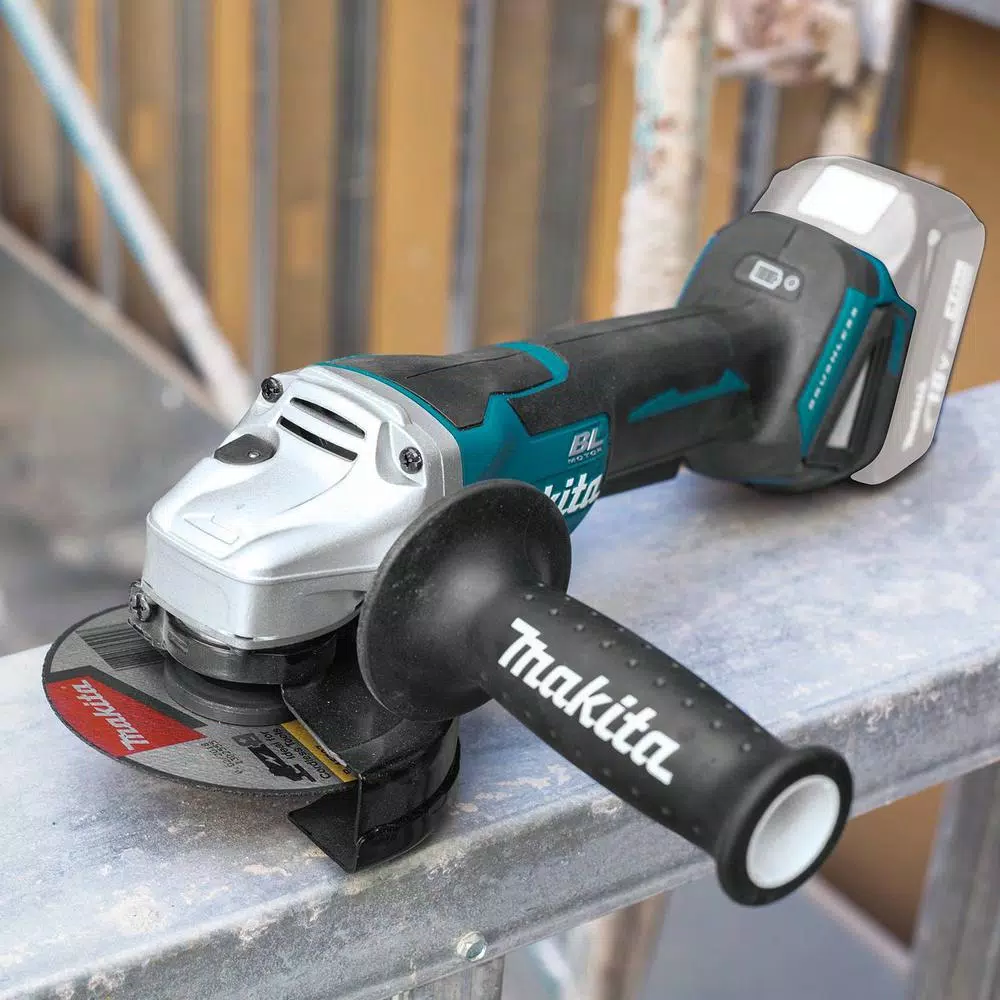 Makita delivers corded grinding performance without the cord with the 18-Volt LXT Lithium-Ion Brushless 4-1/2 in. or 5 in. Cut-Off/Angle Grinder with Paddle Switch (model XAG11Z, tool only, batteries and charger sold separately). Itβs powered by a Makita brushless motor for longer run time, increased power and speed and longer tool life. For the most demanding applications, Makitaβs exclusive Automatic Speed Change Technology automatically adjusts speed and torque during operation for optimal performance. For added convenience, the XAG11Z has an electric brake that stops the wheel in 2-seconds or less upon release of the paddle switch. The XAG11Z is ideal for grinding, cutting and sanding a wide range of materials including tile, concrete, pipe, conduit and more. For improved tool performance and extended battery life, Makita created Star Protection Computer Controls. Star Protection is communication technology that allows the Star Protection-equipped tool and battery to exchange data in real time and monitor conditions during use to protect against overloading, over-discharging and overheating. For increased versatility, the tool can also be powered by Makita 18-Volt LXT and Compact Lithium-Ion batteries with the Star Symbol on the battery indicating Star Protection inside.