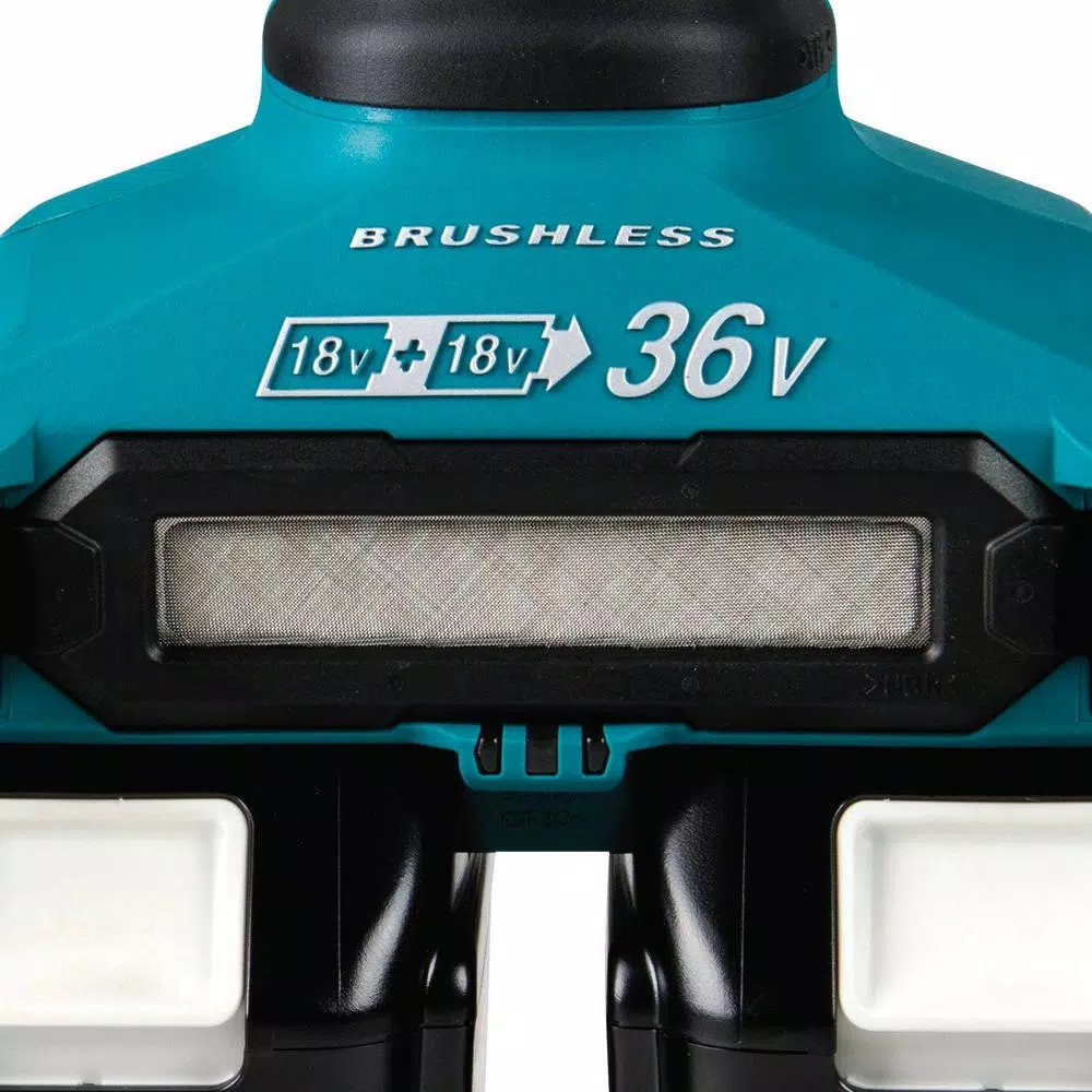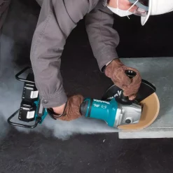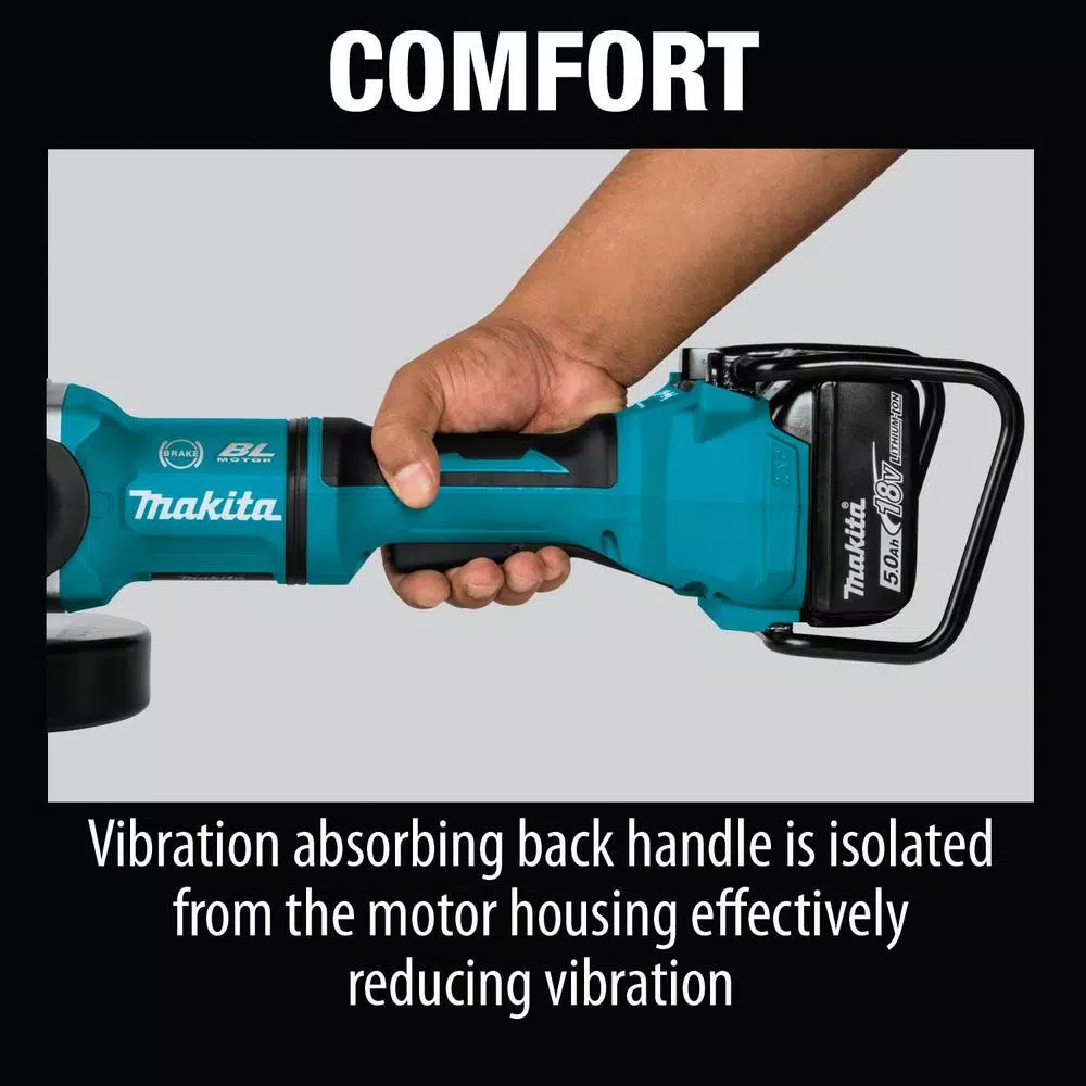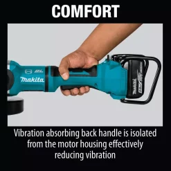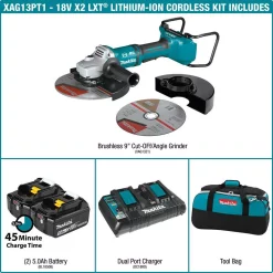 Makita, a pioneer in brushless motor technology and battery innovation, combines both in the 18V X2 LXT (36V) Lithium-Ion Brushless 9 in. Paddle Switch Cut-Off/Angle Grinder with Electric Brake. It’s powered by two 18V Lithium-Ion batteries for 36V power and performance, and has an electronically-controlled BL Brushless motor that matches torque and RPM to the application. Makita 18V X2 means freedom from the cord, even for demanding applications like grinding and cut-off applications that often call for a corded grinder. Best of all, users can remain in one battery platform, using the same fast-charging 18V batteries on the XAG13 as they use across the Makita 18V LXT cordless tool system. The XAG13 is equipped with efficiency features for maximum performance. The electric brake stops the grinding or cut-off wheel in 4.5 seconds or less for maximum productivity, and the Electronic Torque Control turns the motor off if rotation speed suddenly slows or the wheel is forced to a stop. For consistent performance, Automatic Speed Change technology adjust speed and torque during operation. For added comfort, the vibration absorbing back handle is isolated from the motor housing for reduced vibration, and the soft start feature suppresses start-up reaction for smoother start-ups and longer gear life. It has a no lock-on rear paddle trigger switch, and the anti-restart protection is engineered to prevent motor start-up when the battery is inserted with the switch locked on.