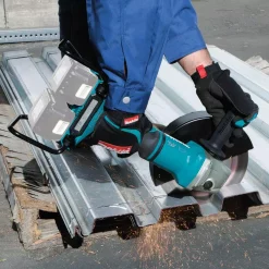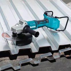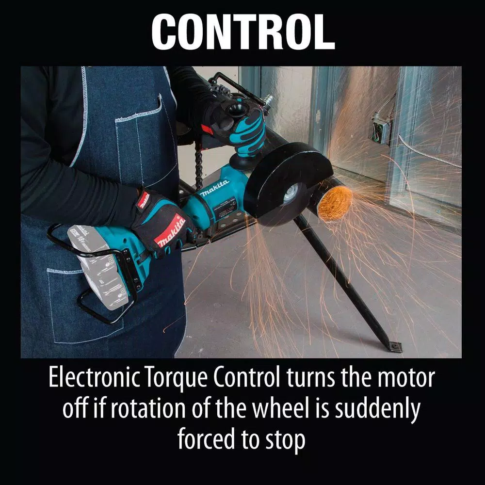 Makita, a pioneer in brushless motor technology and battery innovation, combines both in the 18V X2 LXT (36V) Lithium-Ion Brushless 9 Paddle Switch Cut-Off/Angle Grinder with Electric Brake. Itโs powered by two 18V Lithium-Ion batteries (sold separately) for 36V power and performance, and has an electronically-controlled BL Brushless motor that matches torque and RPM to the application. Makita 18V X2 means freedom from the cord, even for demanding applications like grinding and cut-off applications that often call for a corded grinder. Best of all, users can remain in one battery platform, using the same fast-charging 18V batteries on the XAG13 as they use across the Makita 18V LXT cordless tool system. The XAG13 is equipped with efficiency features for maximum performance. The electric brake stops the grinding or cut-off wheel in 4.5 seconds or less for maximum productivity, and the Electronic Torque Control turns the motor off if rotation speed suddenly slows or the wheel is forced to a stop. For consistent performance, Automatic Speed Change technology adjust speed and torque during operation. For added comfort, the vibration absorbing back handle is isolated from the motor housing for reduced vibration, and the soft start feature suppresses start-up reaction for smoother start-ups and longer gear life.