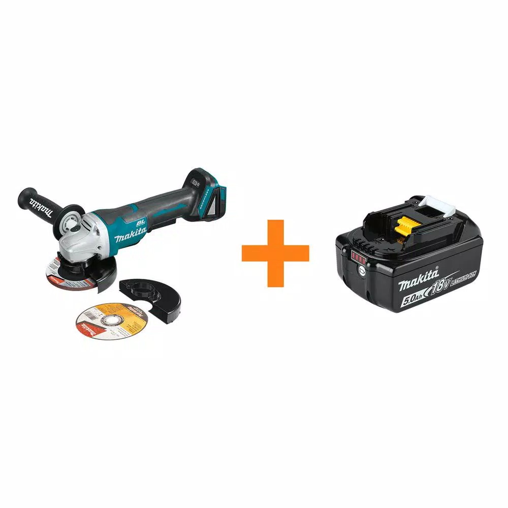 Makita delivers corded grinding performance without the cord with the 18-Volt LXT Lithium-Ion Brushless 4-1/2 in. or 5 in. Cut-Off/Angle Grinder with Paddle Switch (model XAG11Z, tool only, batteries and charger sold separately). Itโs powered by a Makita brushless motor for longer run time, increased power and speed and longer tool life. For the most demanding applications, Makitaโs exclusive Automatic Speed Change Technology automatically adjusts speed and torque during operation for optimal performance. For added convenience, the XAG11Z has an electric brake that stops the wheel in 2-seconds or less upon release of the paddle switch. The XAG11Z is ideal for grinding, cutting and sanding a wide range of materials including tile, concrete, pipe, conduit and more. For improved tool performance and extended battery life, Makita created Star Protection Computer Controls. Star Protection is communication technology that allows the Star Protection-equipped tool and battery to exchange data in real time and monitor conditions during use to protect against overloading, over-discharging and overheating. For increased versatility, the tool can also be powered by Makita 18-Volt LXT and Compact Lithium-Ion batteries with the Star Symbol on the battery indicating Star Protection inside. This Promotion also comes with a bonus BL1850B 18-Volt LXT Lithium-Ion 5.0Ah Battery.