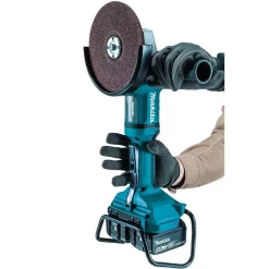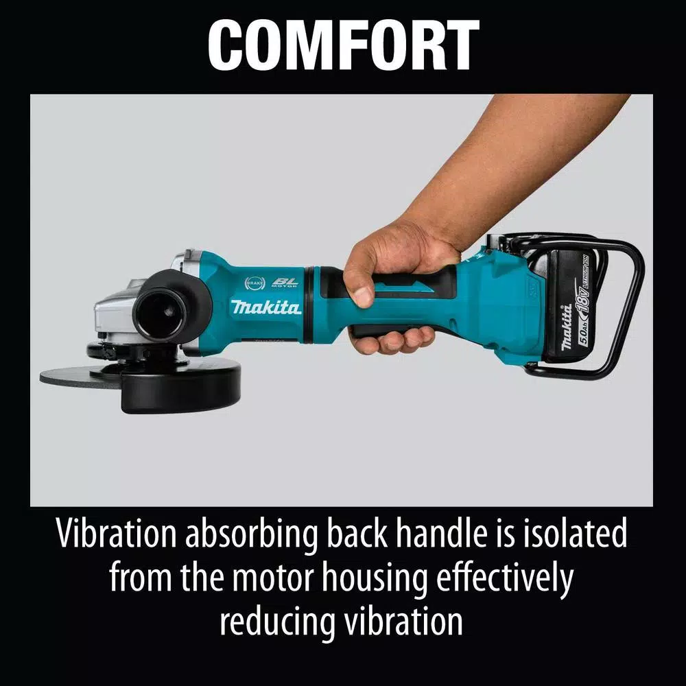 Makita, a pioneer in brushless motor technology and battery innovation, combines both in the 18V X2 (36V) LXT Lithium-Ion Brushless 7″ Paddle Switch/Angle Grinder with Electric Brake. It’s powered by two 18V Lithium-Ion batteries for 36V power and performance, and has an electronically-controlled BL Brushless motor that matches torque and RPM to the application. Makita 18V X2 means freedom from the cord, even for demanding applications like grinding and cut-off applications that often call for a corded grinder. Best of all, users can remain in one battery platform, using the same fast-charging 18V batteries on the XAG12PT as they use across the Makita 18V LXT cordless tool system. The XAG12PT is equipped with efficiency features for maximum performance. The electric brake stops the grinding or cut-off wheel in 4.5 second or less for maximum productivity, and the Electronic Torque Control turns the motor off if rotation speed suddenly slows or the wheel is forced to a stop. For consistent performance, Automatic Speed Change technology adjust speed and torque during operation. For added comfort the vibration absorbing back handle is isolated from the motor housing for reduced vibration, and the soft start feature suppresses start-up reaction for smoother start-ups and longer gear life. This Promotion also comes with a bonus 741421-B-10 9″ x 7/8″ x 1/4″ Grinding Wheel, 24 Grit, General Purpose Metal, 10/pk.