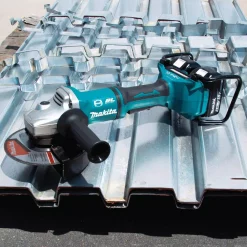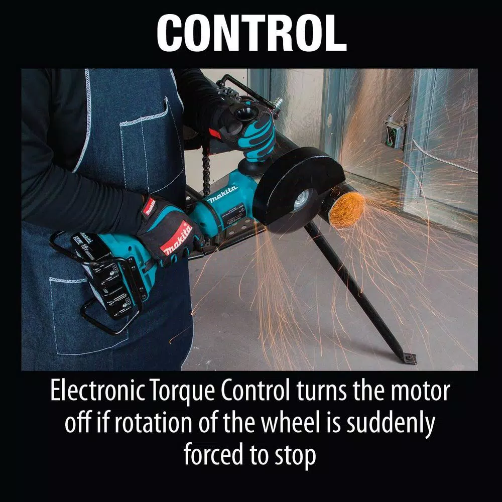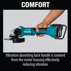 Makita, a pioneer in brushless motor technology and battery innovation, combines both in the 18-Volt X2 LXT (36-Volt) Lithium-Ion Brushless 7 Paddle Switch/Angle Grinder with Electric Brake. It’s powered by two 18V Lithium-Ion batteries for 36-Volt power and performance and has an electronically-controlled BL Brushless motor that matches torque and RPM to the application. Makita 18-Volt X2 means freedom from the cord, even for demanding applications like grinding and cut-off applications that often call for a corded grinder. Best of all, users can remain in one battery platform, using the same fast-charging 18-Volt batteries on the XAG12PT as they use across the Makita 18-Volt LXT cordless tool system. The XAG12PT is equipped with efficiency features for maximum performance. The electric brake stops the grinding or cut-off wheel in 4.5 second or less for maximum productivity and the Electronic Torque Control turns the motor off if rotation speed suddenly slows or the wheel is forced to a stop. For consistent performance, Automatic Speed Change technology adjust speed and torque during operation. For added comfort the vibration absorbing back handle is isolated from the motor housing for reduced vibration and the soft start feature suppresses start-up reaction for smoother start-ups and longer gear life. It has a no lock-on rear paddle trigger switch and the anti-restart protection is engineered to prevent motor start-up when the battery is inserted with the switch locked on.