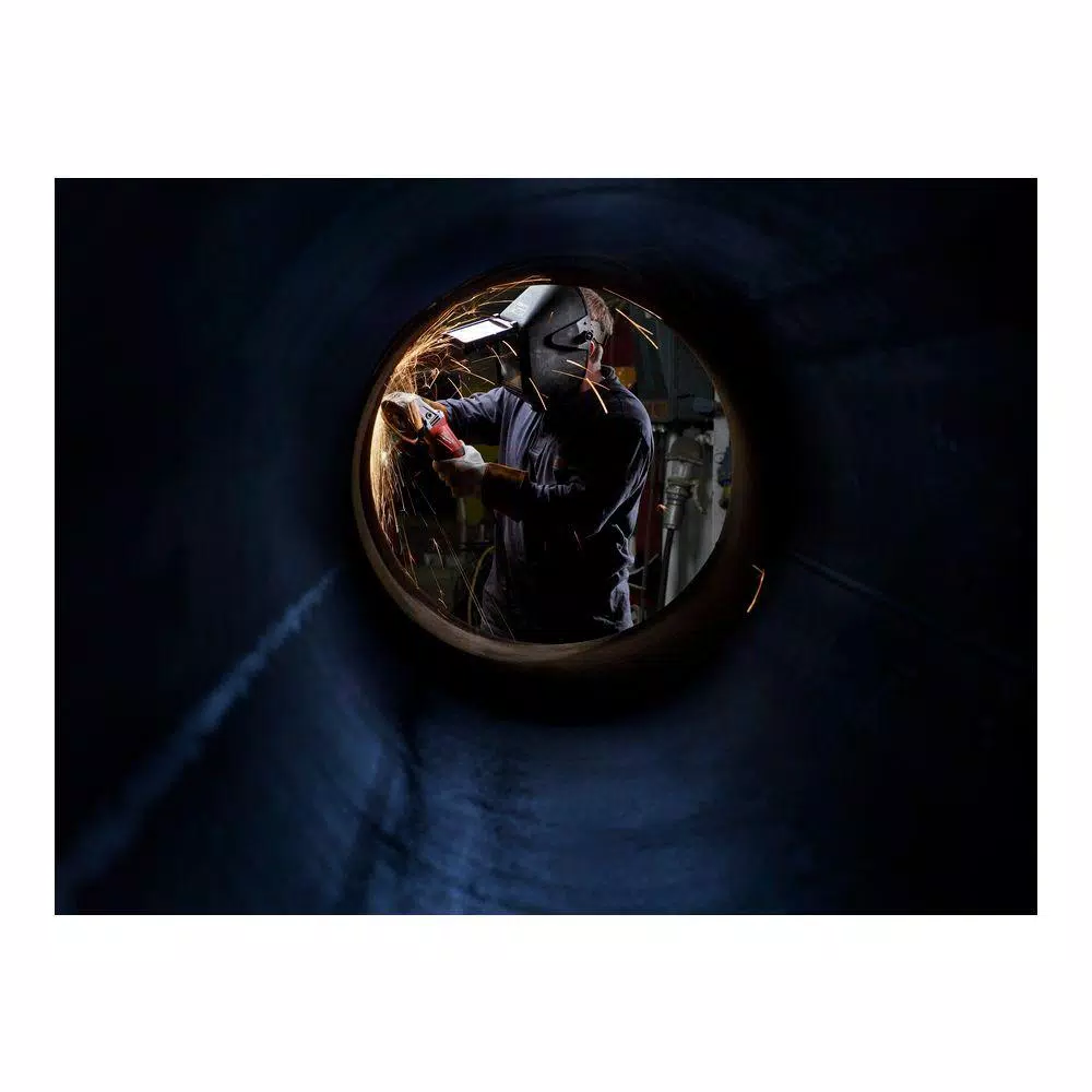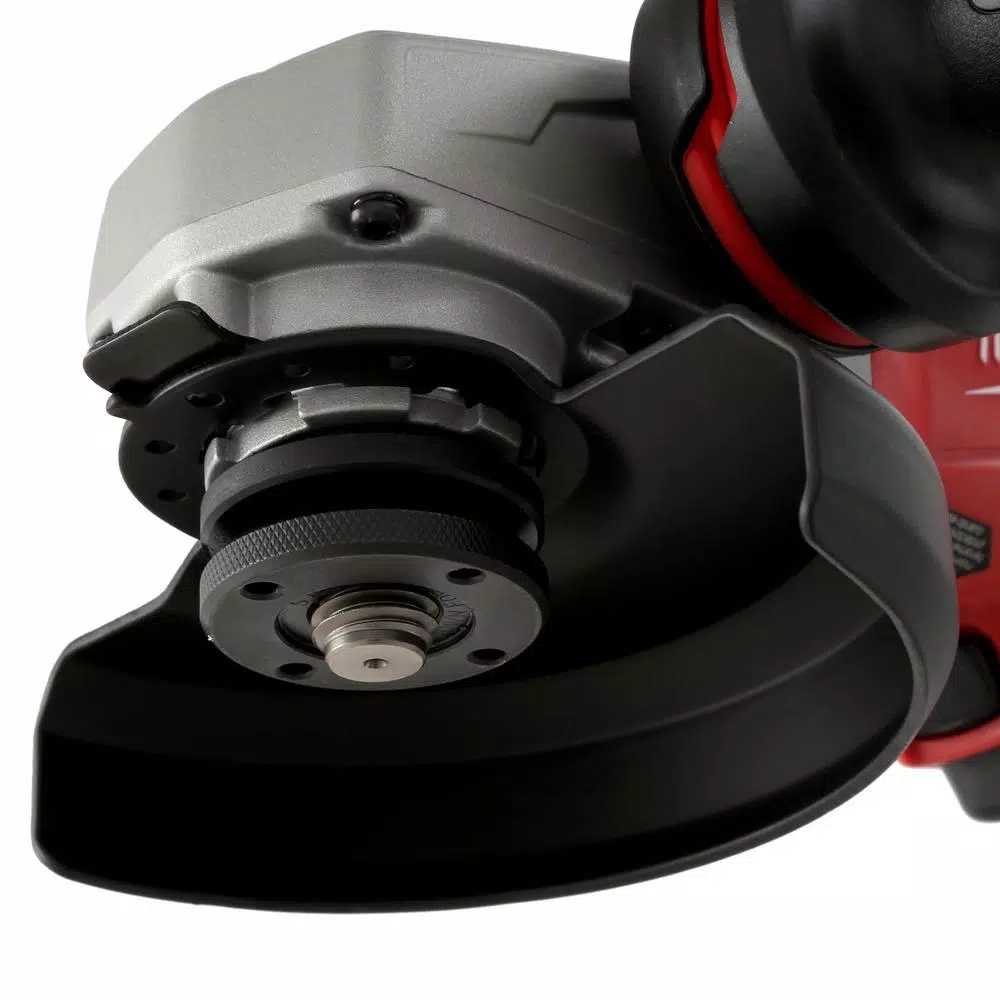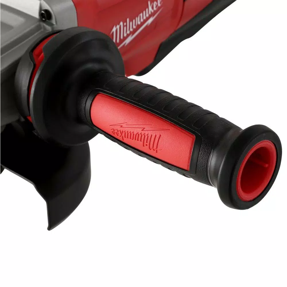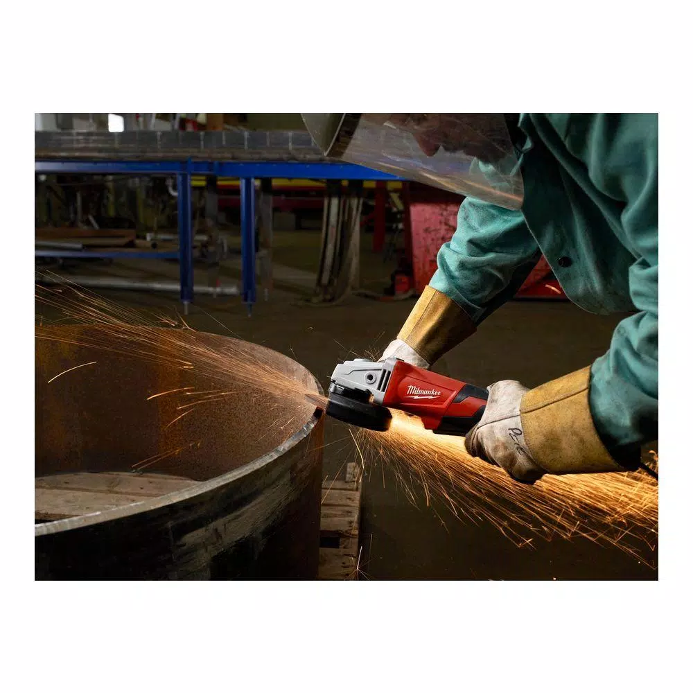 Designed for heavy-duty use in demanding conditions, this 13 Amp small angle grinder from Milwaukee maintains speed under load to power through tough jobs. Undeterred by industrial-grade materials, this 5 in. grinder spins up to 11,000 RPM with enhanced circuitry to prevent overloading or overheating. A tool-free design enables operators to replace all accessories without a wrench while the electronic clutch keeps internal components humming smoothly. A vibration-inhibiting side handle affords users with stability and leverage to conquer toilsome cutting and grinding tasks. Keep this machine in running mode with a paddle-positioned lock-on switch.