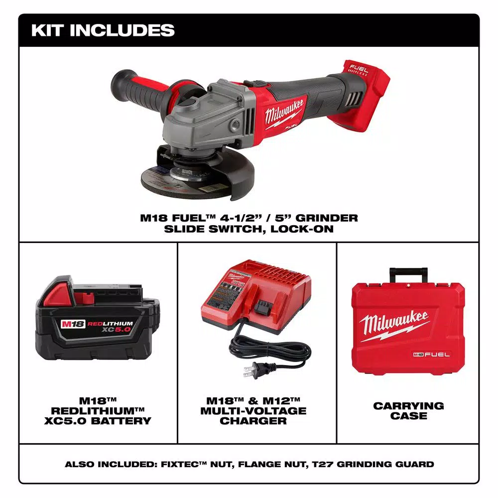 - Includes: (1) M18 FUEL 4-1/2β³ / 5β³ Grinder, Slide Switch Lock-On (Tool Only) (2781-20), (1) M18 & M12 Multi-Voltage Charger (48-59-1812), (1) M18 REDLITHIUM XC5.0 Extended Capacity Battery Pack (48-11-1850), (1) Spanner Wrench, (1) Wheel Guard (1) Carrying Case, (1) Flange Nuts