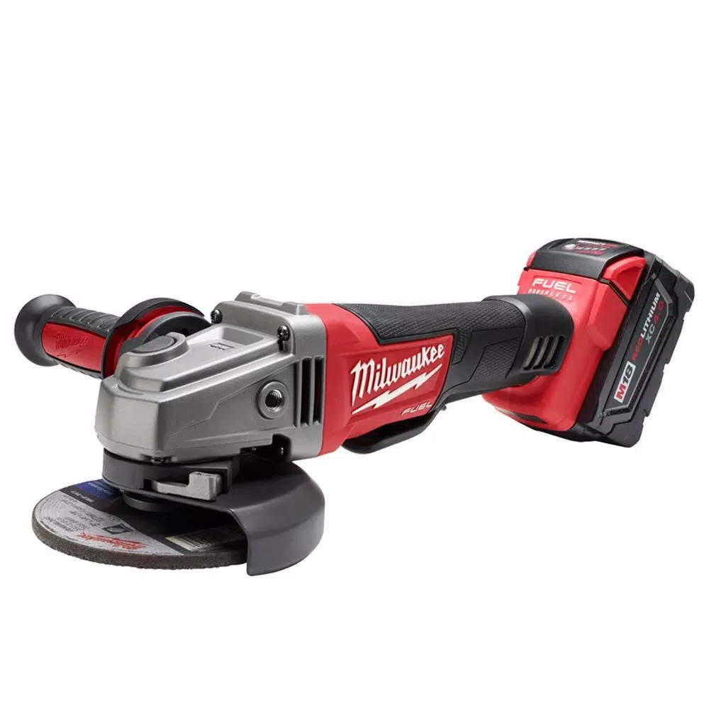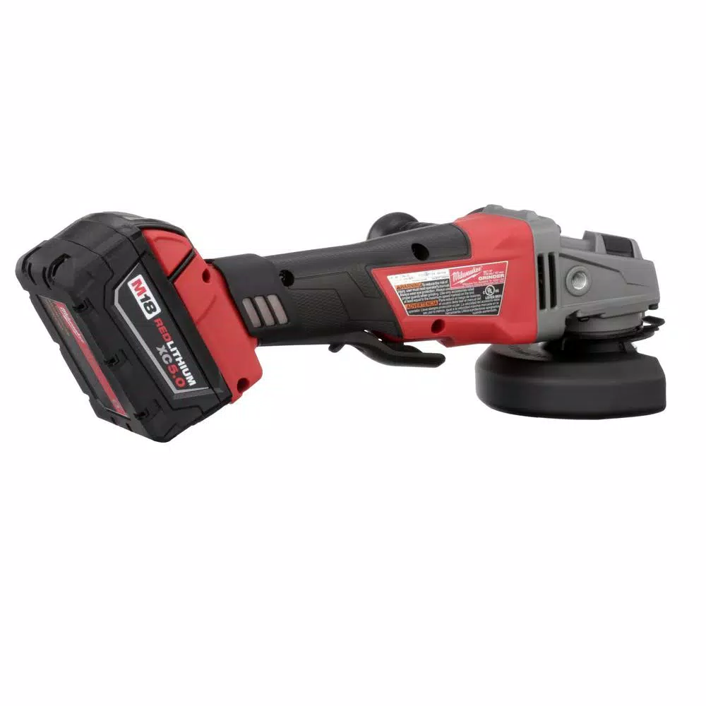 The worldโs first cordless grinder delivers the power of a corded grinder with up to 2X more run time and up to 10X longer motor life. The M18 FUEL 4-1/2 in. / 5 in. Grinder supplies maximum sustained power to complete the toughest grinding, surface preparation and cutting applications. The POWERSTATE Brushless Motor provides up to 10X longer motor life and lower cost of ownership. The M18 REDLITHIUM XC5.0 Battery Pack delivers up to 4X more run time and 20% more power. The grinder features REDLINK PLUS Intelligence, the most advanced system of cordless power tool electronics, for maximum performance. The 18-Volt lithium-ion grinderโs thin body design gives it optimized balance to rest easily in your hands. Tool-free accessory changes and guard adjustments mean less downtime during work. The grinder is built with the same tool body, gearing system and anti-vibration side handle as Milwaukeeโs legendary high-performance corded grinders for maximum durability on the job. The kit includes 2 M18 REDLITHIUM XC5.0 Extended Capacity Battery Packs, a multi-voltage charger and carrying case. Grinding wheel sold separately.