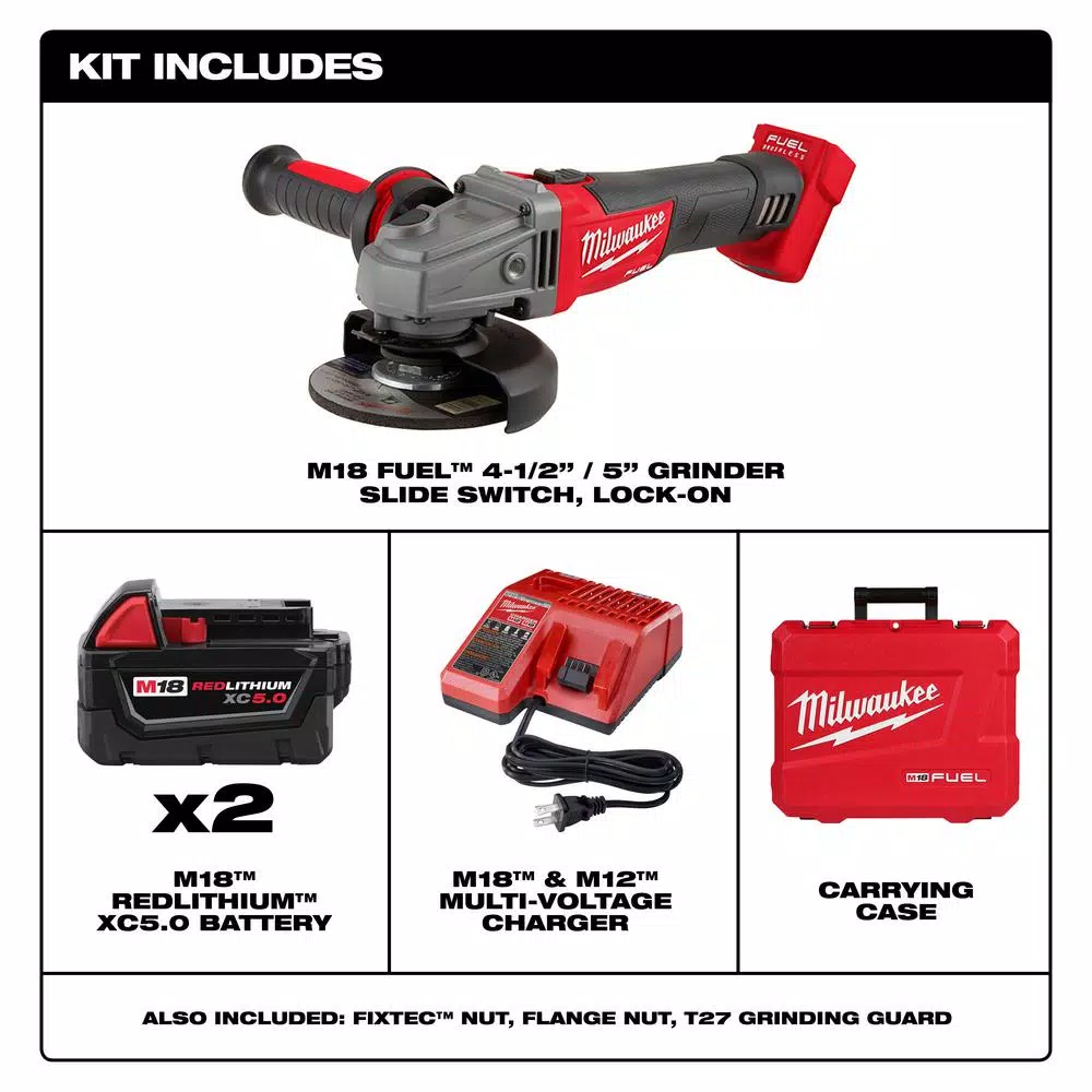 - Includes: one M18 FUEL 4-1/2 in./5 in. grinder, slide switch lock-on (bare tool) (2781-20), two M18 REDLITHIUM XC5.0 extended capacity battery pack (48-11-1850), 1 M18 and M12 multi-voltage charger (48-59-1812), 1 carrying case, 1 flange nuts, 1 wheel guard, 1 spanner wrench