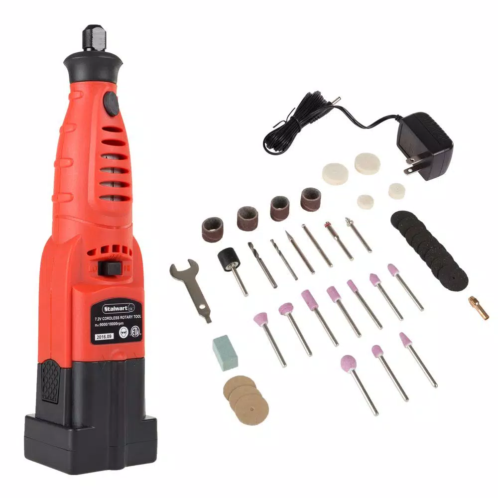 The 7.2-Volt Cordless 7.75 in. Grinder Rotary Tool Kit is ideal for jobs on the go. The accessories in this kit fit all standard rotary tools and are perfect for sanding, grinding, polishing buffing, sharpening cleaning and carving. This set can be used on wood, metal, glass and ceramics.