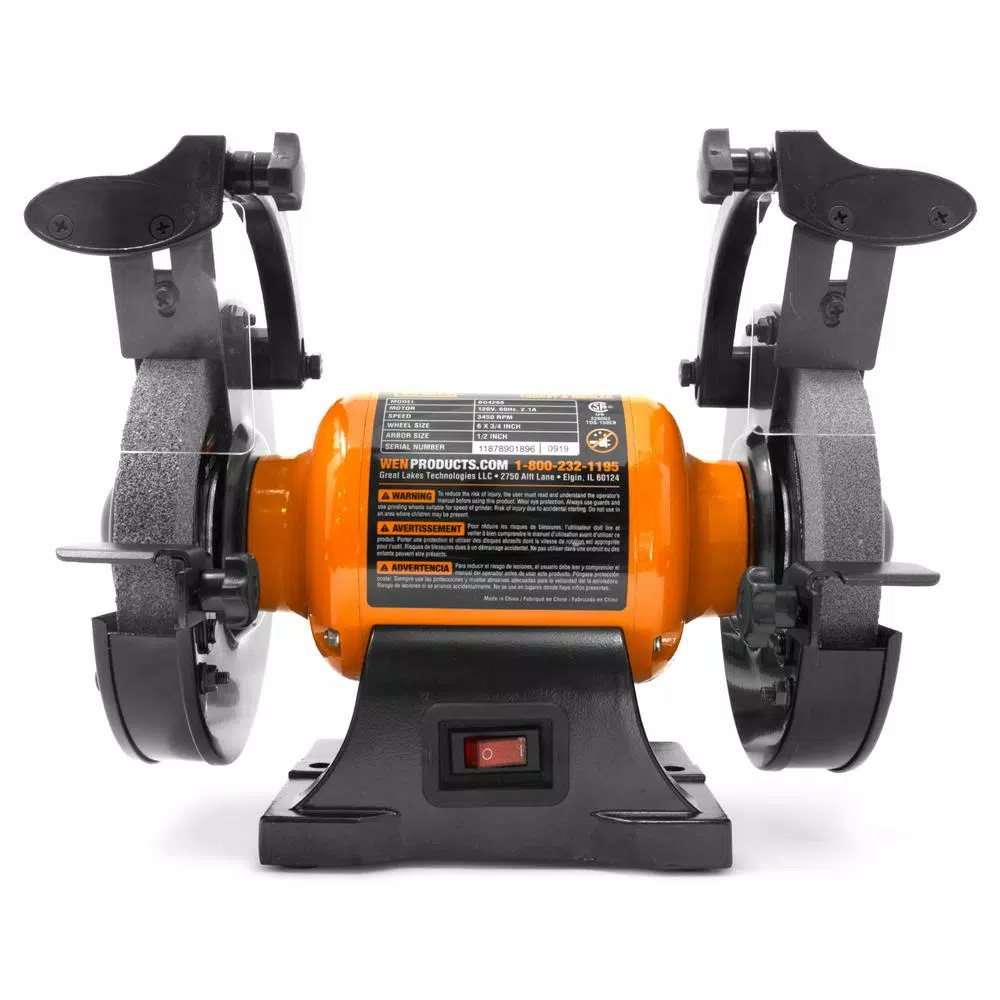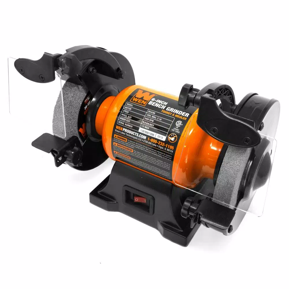 Remember when you spent all that money replacing dull, rusty tools. From deburring ragged edges to sharpening blades, the WEN Bench Grinder saves you time and money by resuscitating old, worn down knives, tools and bits. Compact yet powerful, the WEN 6 in. Bench Grinder provides reliability even in the face of the most difficult tasks. Our package includes two 6 in. x 3/4 in. wheels: a 60-grit wheel for general purpose grinding and a coarse 36-grit wheel for faster material removal. With our quiet 2.1 Amp motor, expect quick startups and smooth performance at speeds of up to 3450 RPM. Built with you in mind, our design makes wheel changes quick and easy. The onboard, impact-resistant eye shields keep your eyes safe and your project visible. Adjustable work rests pivot to allow for angled grinding applications. And because its a WEN product, your bench grinder comes backed by a 2-year warranty, a stocked inventory of replacement parts and a friendly customer phone line. No need to waste any more money on new tools. The WEN 6 in. Bench Grinder revives all of your tools back to their original sharp state. Compatible with the WEN WW6012 6 in. Wire Wheel. Remember when your blades could actually cut through something. Remember WEN.