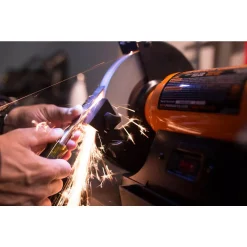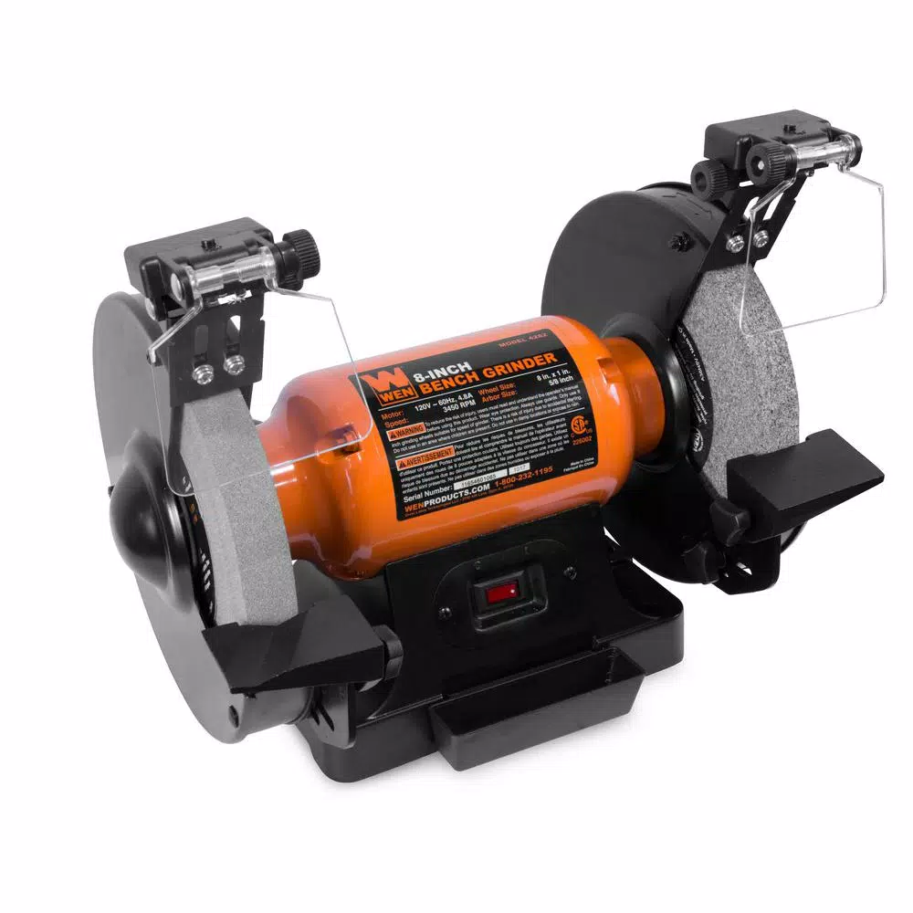 From deburring ragged edges to cleaning objects to sharpening blades, the WEN 8 in. 4.8 Amp Bench Grinder helps resuscitate old worn down knives, tools and bits, saving you time and money. Compact yet powerful, the WEN 8 in. Bench Grinder provides reliability even in the face of the most difficult tasks. Our package includes two 8 in. by 1 in. wheels: a 60-grit wheel for general purpose grinding and a coarse 36-grit wheel for faster material removal. The onboard coolant tray serves as a quenching pot for work pieces, making sure your tools and blades donβt warp due to excessive heat. With our quiet 4.8 Amp motor, expect quick startups and smooth performance at speeds of up to 3450 rotations per minute. Our design makes wheel guard removal as simple as possible for easy wheel changes. The included eye guards can adjust to prevent them from interfering with your project while their built-in LED lights illuminate your work piece during operation. Adjustable work rests pivot to allow for angled grinding applications. And because its a WEN product, your 8 in. Bench Grinder comes backed by a 2 year warranty, a nationwide network of skilled service technicians and a friendly customer phone line. No need to waste anymore money on new tools. The WEN 8 in. Bench Grinder revives all of your tools back to their sharp original state. Remember when your blades could actually cut through something. Remember WEN.