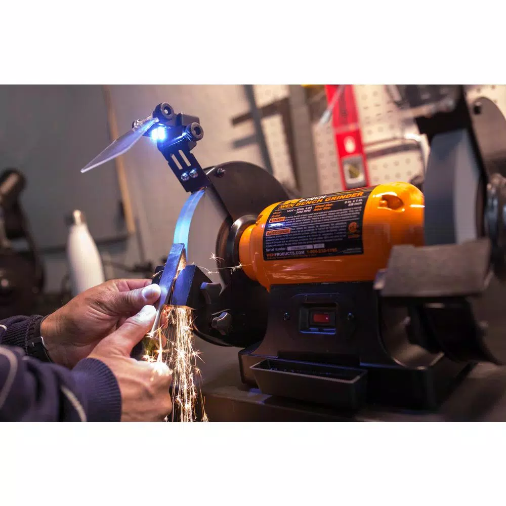 - Features pivoting tool rests and adjustable eye guards with 4 built-in LED lights