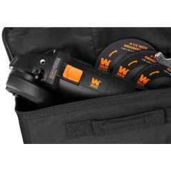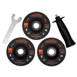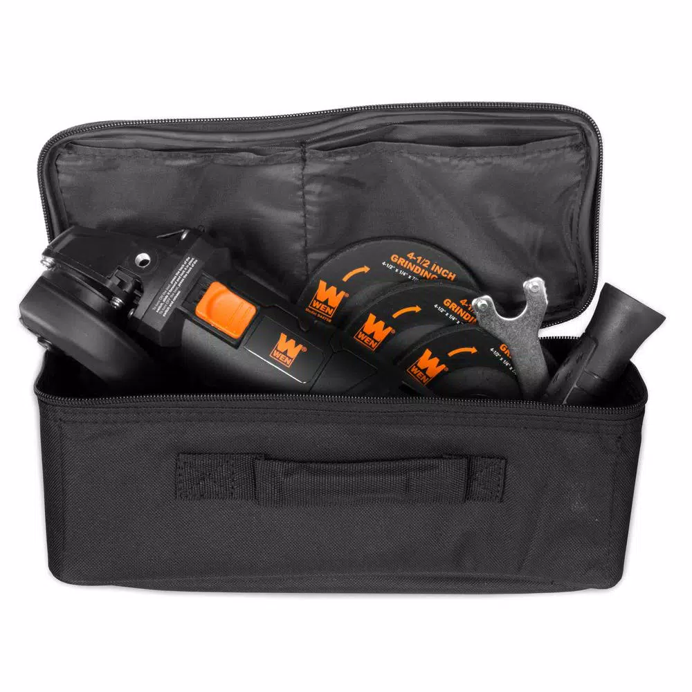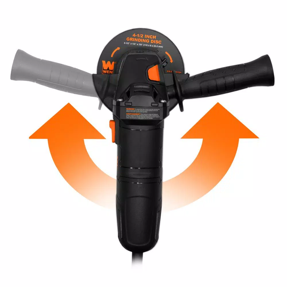 Remember when you could get your grind on Let the sparks fly with the WEN 4-1/2 in. 7.5 Amp Angle Grinder. This powerful grinder comes packed with accessories, including 3 grinding wheels, a reversible auxiliary side handle, an adjustable wheel guard and a compact carrying case. Our lightweight design weighs in at a mere 4 lbs. to limit fatigue during long days on the grind. The lock-on side switch snaps into place to keep the machine running without constantly holding your thumb down on the trigger. The reversible handle can be attached to either the left or right side of the grinder depending on the operators preference. The 7.5 Amp motor generates up to 11,000 RPM, powering through rust, chains, pipes and more. This angle grinder also includes a 5/8 in. 11 UNC spindle that accepts wheels with both 5/8 in. and 7/8 in. arbors. And, because its a WEN product, your 4-1/2 in. 7.5 Amp Angle Grinder comes backed by a 2-year warranty, a stocked inventory of replacement parts and a friendly customer phone line, all to make sure you remember WEN.