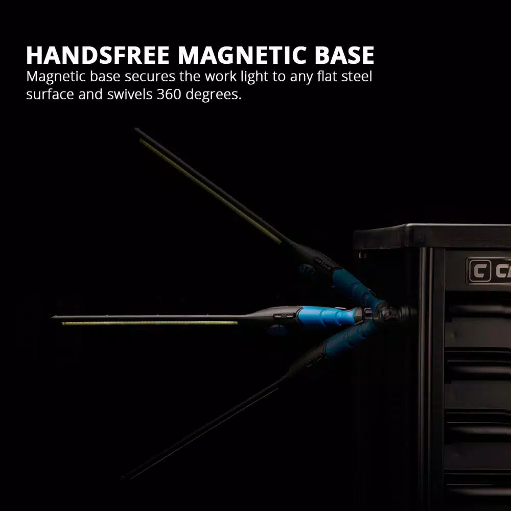 - Handsfree swivel magnetic base secures the work light to any flat steel surface in any orientation, the base swivels 360Β° to give you maximum handsfree coverage