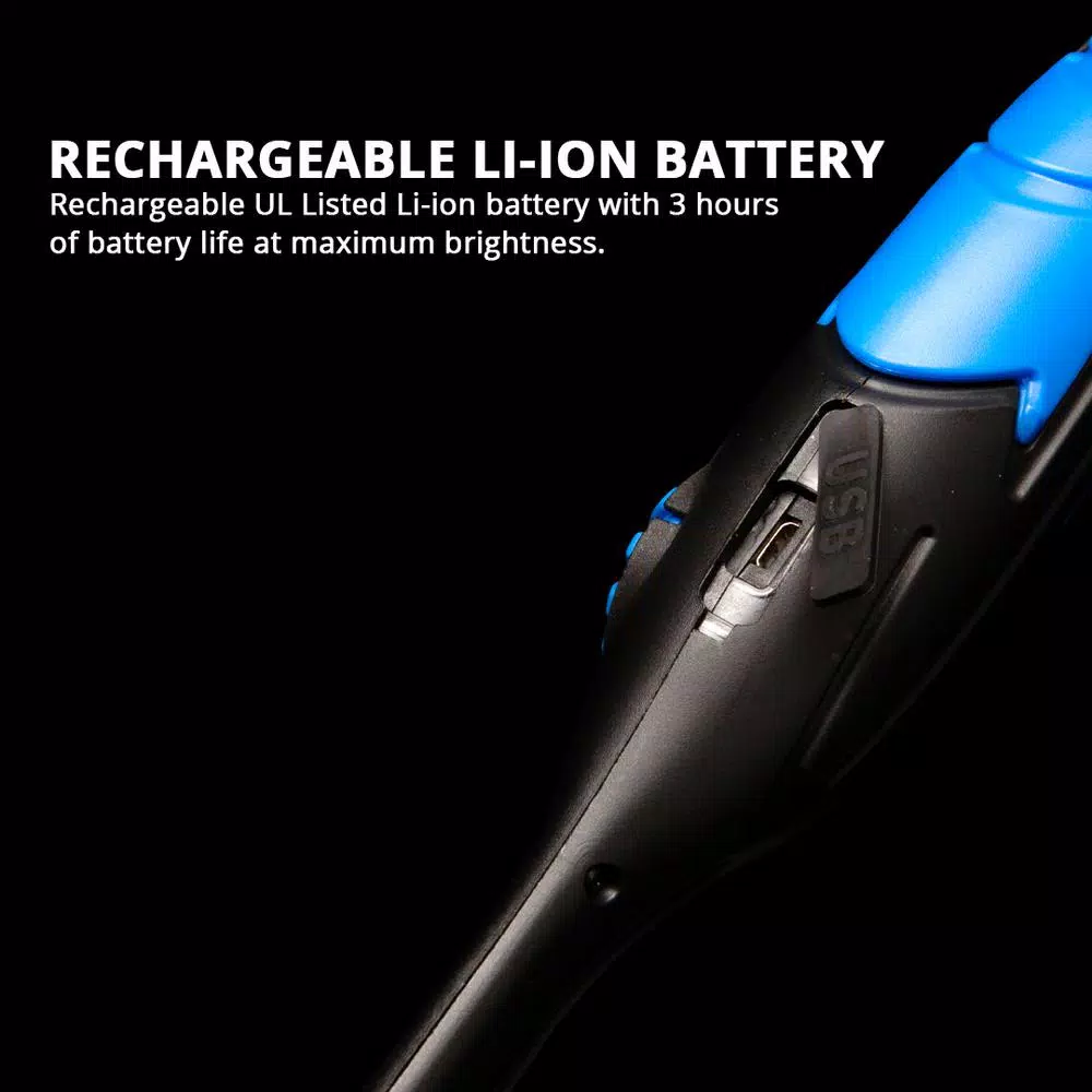 - Rechargeable UL listed lithium-ion battery with 3-hours of battery life at maximum brightness, MicroUSB charger is included