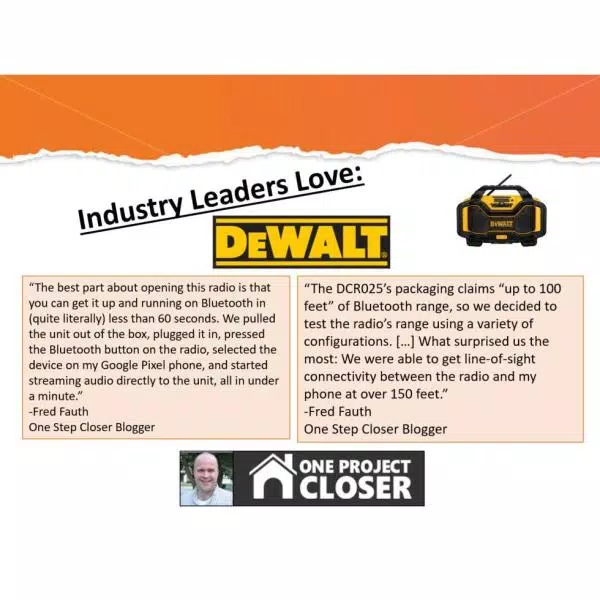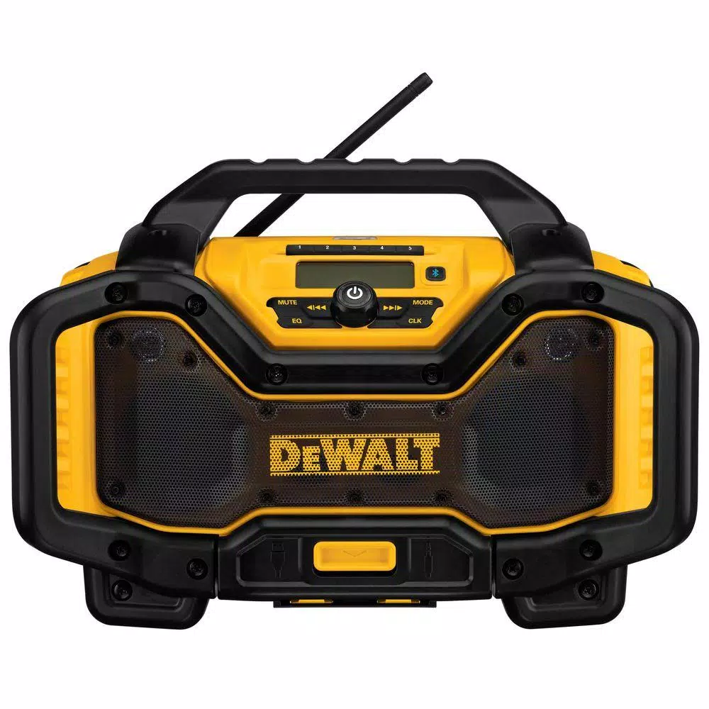 The DCR025 is designed to be the most versatile Jobsite Radio Charger on the market. The unit is able to run off and charge all DEWALT slide pack battery packs including 20-Volt and FLEXVOLT packs at 3 Amp when plugged into an AC outlet. The unit is designed to include woofers, tweeters and air ports to provide clear and rich sound at all volume levels. An oversized device storage box protects devices from worksite conditions and includes an Aux and 2.1 Amp USB charging port for convenient device charging. 2 AC Power outlets on the side of the unit allow you to plug in additional tools or chargers without occupying additional outlets on the wall. AVRCP (Audio Visual Remote Control Protocol) allows you to control your device from the radio interface so you can keep the device in a safe place and skip to the next song or hit replay on the radio interface.