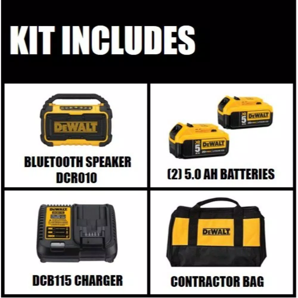 The DCR010 is designed to be the most versatile Bluetooth speaker on the market. The unit is able to run off DEWALT slide pack battery packs including 12-Volt, 20-Volt, and FLEXVOLT packs. Can be run in AC current mode with provided power cord. Keep your DEWALT 20-Volt tools running longer with the 20-Volt MAX Lithium-Ion Premium Battery and Charger Kit. The batteries are compatible with the complete line of DEWALT 20-Volt MAX tools. The charger is compatible with all DEWALT 12-Volt and 20-Volt MAX Lithium-Ion battery packs, this charger is easy to use, quiet and exceptionally stable with its 4 plastic feet. This kit includes 2 DCB205 batteries, DCB115 charger and kit bag.