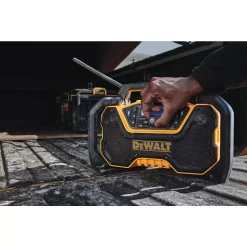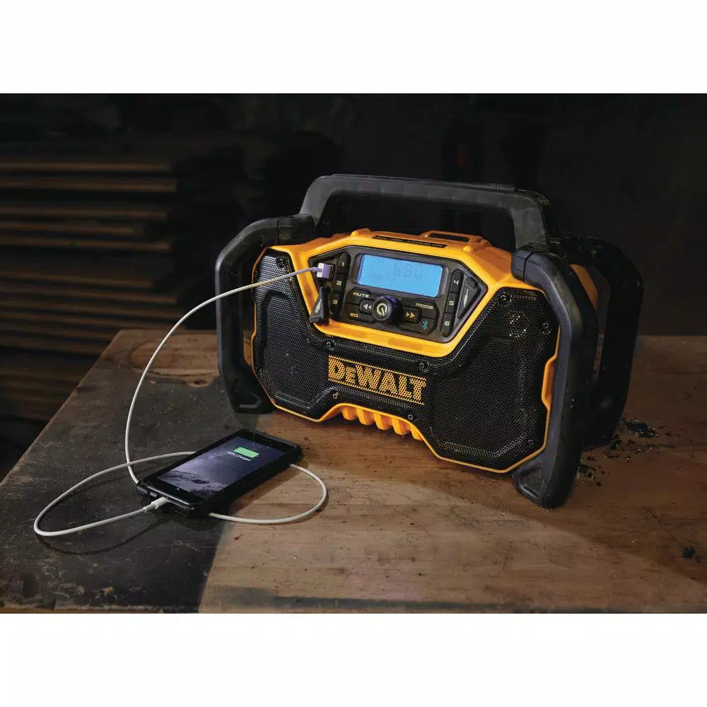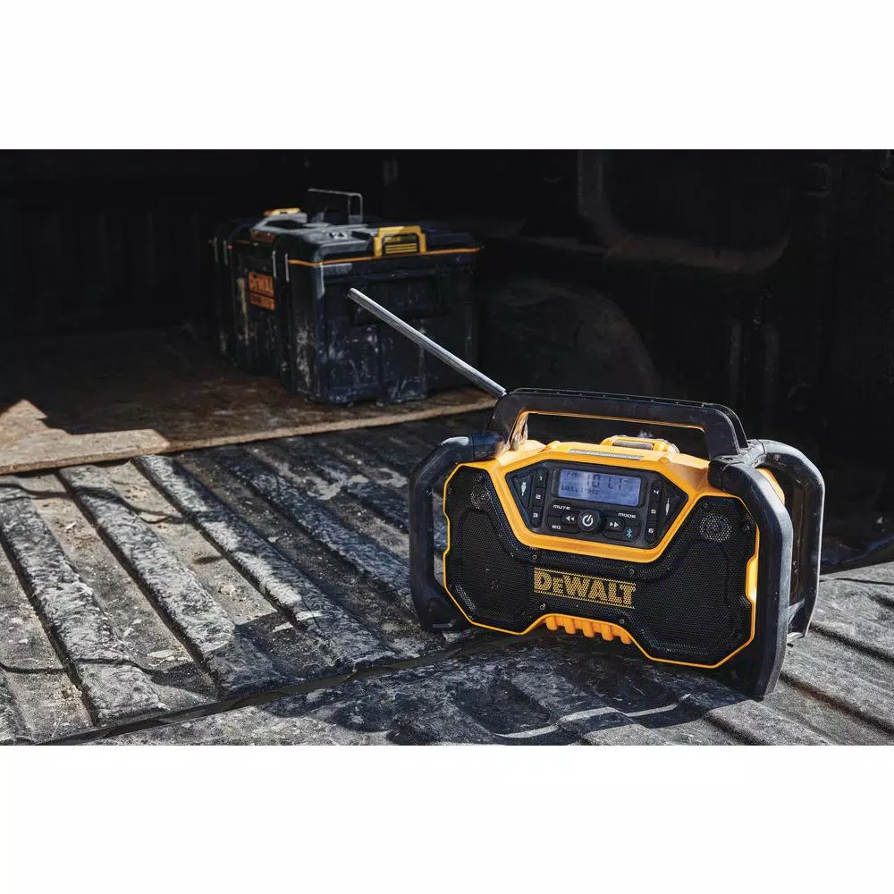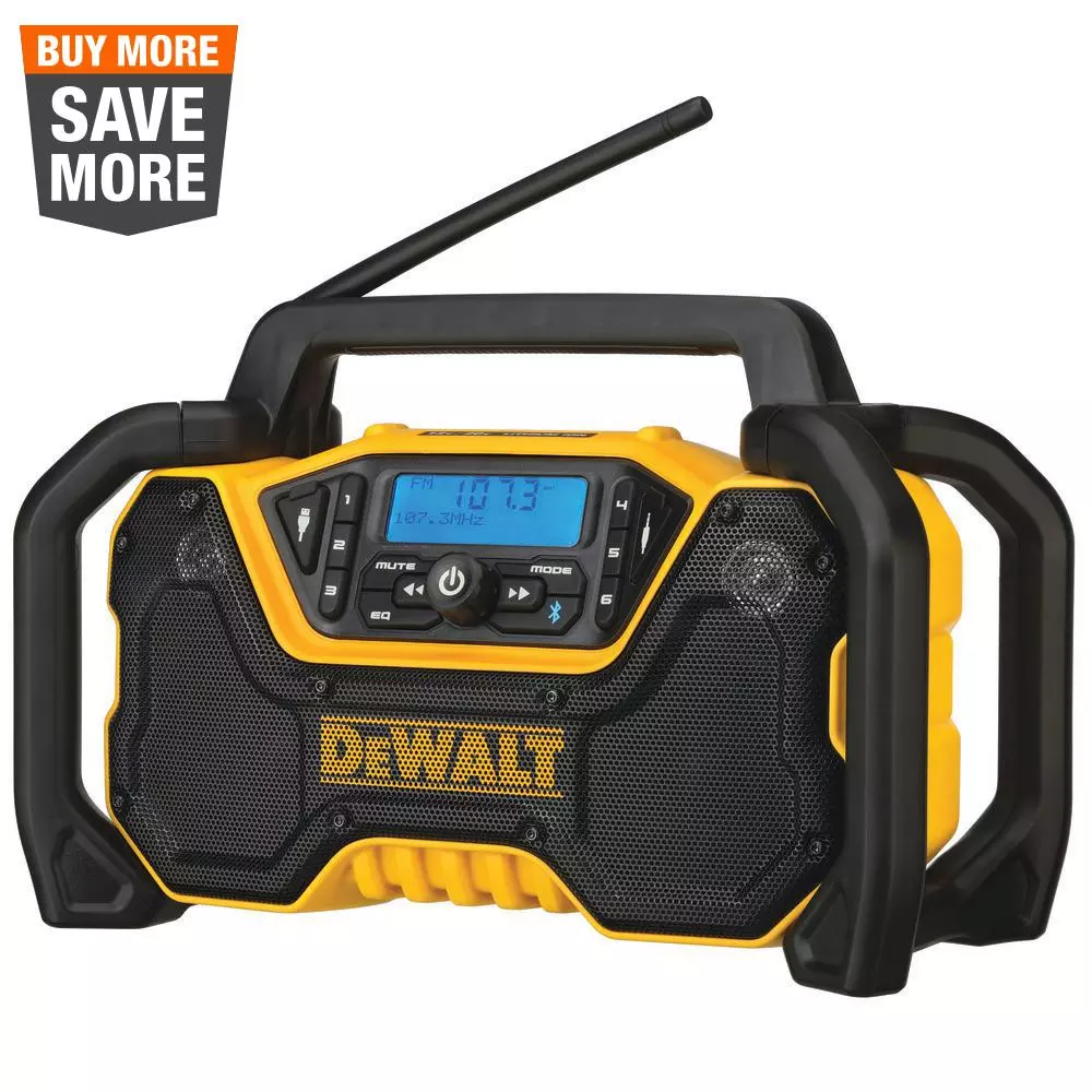 The DEWALT DCR028B 12-Volt/20-Volt MAX Jobsite Bluetooth Radio provides premium sound in the toughest work environments. Its durable roll-cage design withstands drops and impacts, while innovative handle stores and protects radio antenna when not in use. Quad speakers kick out true stereo sound with deep bass. Stream music via Bluetooth from up to 100 ft. or connect through the built-in auxiliary port. AM/FM radio includes 6 customizable presets per band. A convenient USB port charges your mobile devices. DCR028B includes detachable AC power cord or power with DEWALT 12-Volt MAX, 20-Volt MAX or FLEXVOLT batteries (sold separately). Jobsite Bluetooth Radio includes 3-year limited warranty.