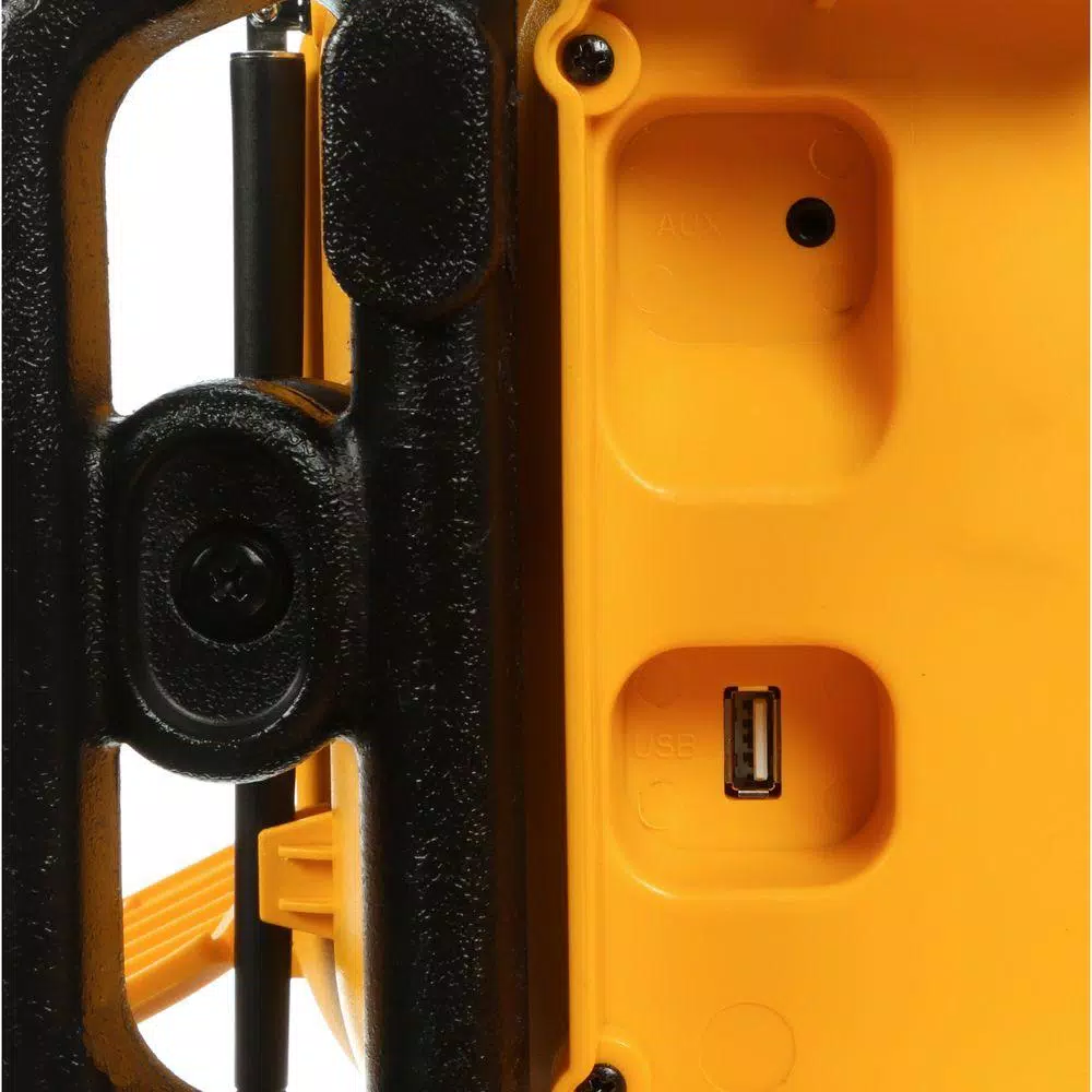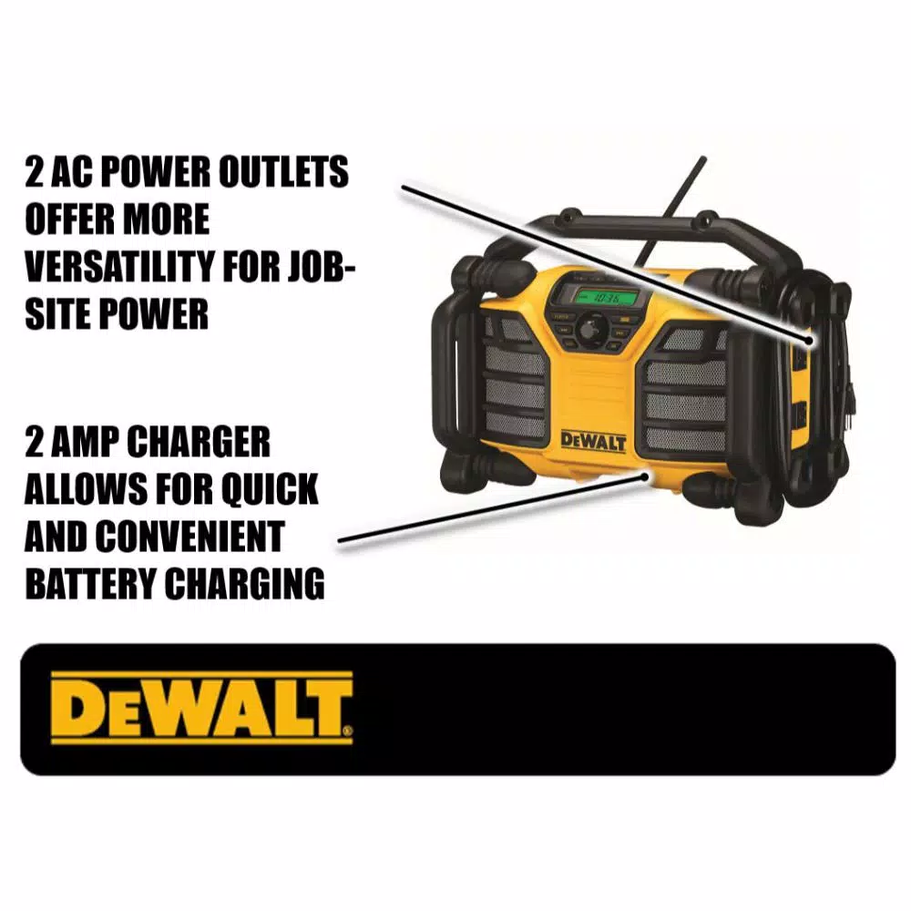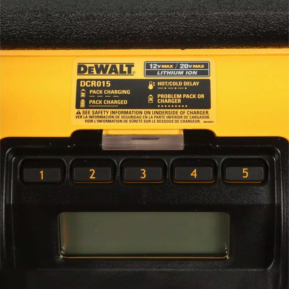 The DEWALT 12/20-Volt Max Charger and Radio (DCR015) provides a full range of rich sound while running off DEWALTโs 12-Volt/20-Volt Max batteries or AC power cord. Designed for versatility, it also allows you to charge batteries while plugged into an AC power source. The charger/radio features both auxiliary and USB ports to let you connect to CD or mp3 players, portable satellite receivers and other digital audio devices for a custom audio experience.