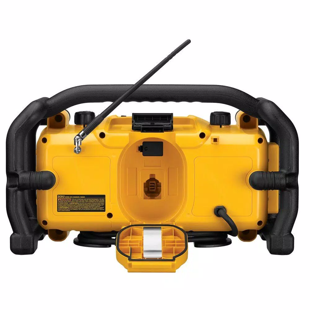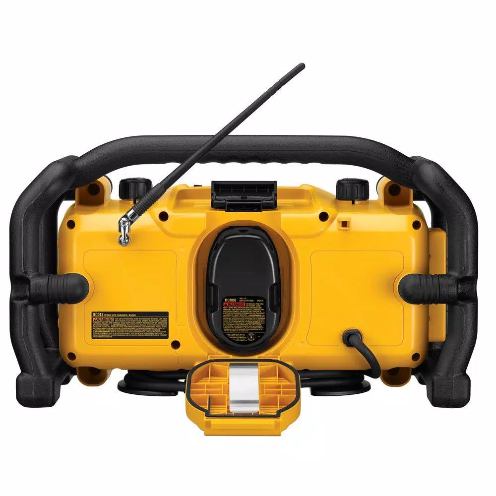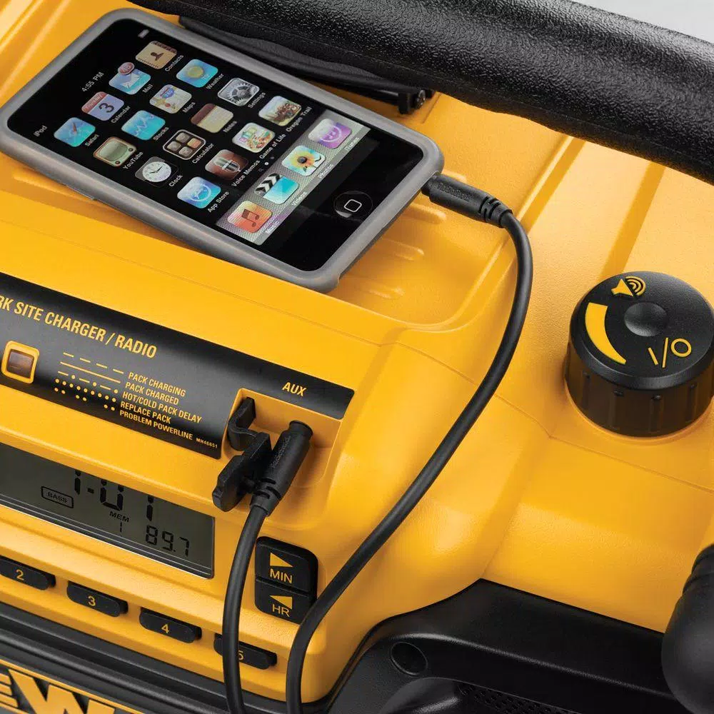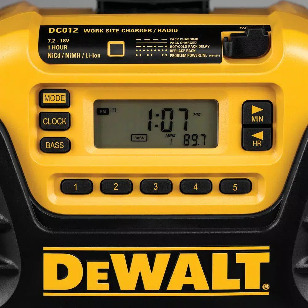 The DEWALT 7.2-Volt โ 18-Volt Work-Site Charger/Radio functions as an AM/FM radio and recharges your 7.2-Volt โ 18-Volt DEWALT batteries (batteries not included). The 3-stage charger can recharge your batteries in as little as 1 hour and the radio can run off of 7.2-Volt โ 18-Volt batteries for cordless operation.