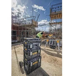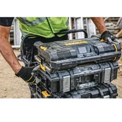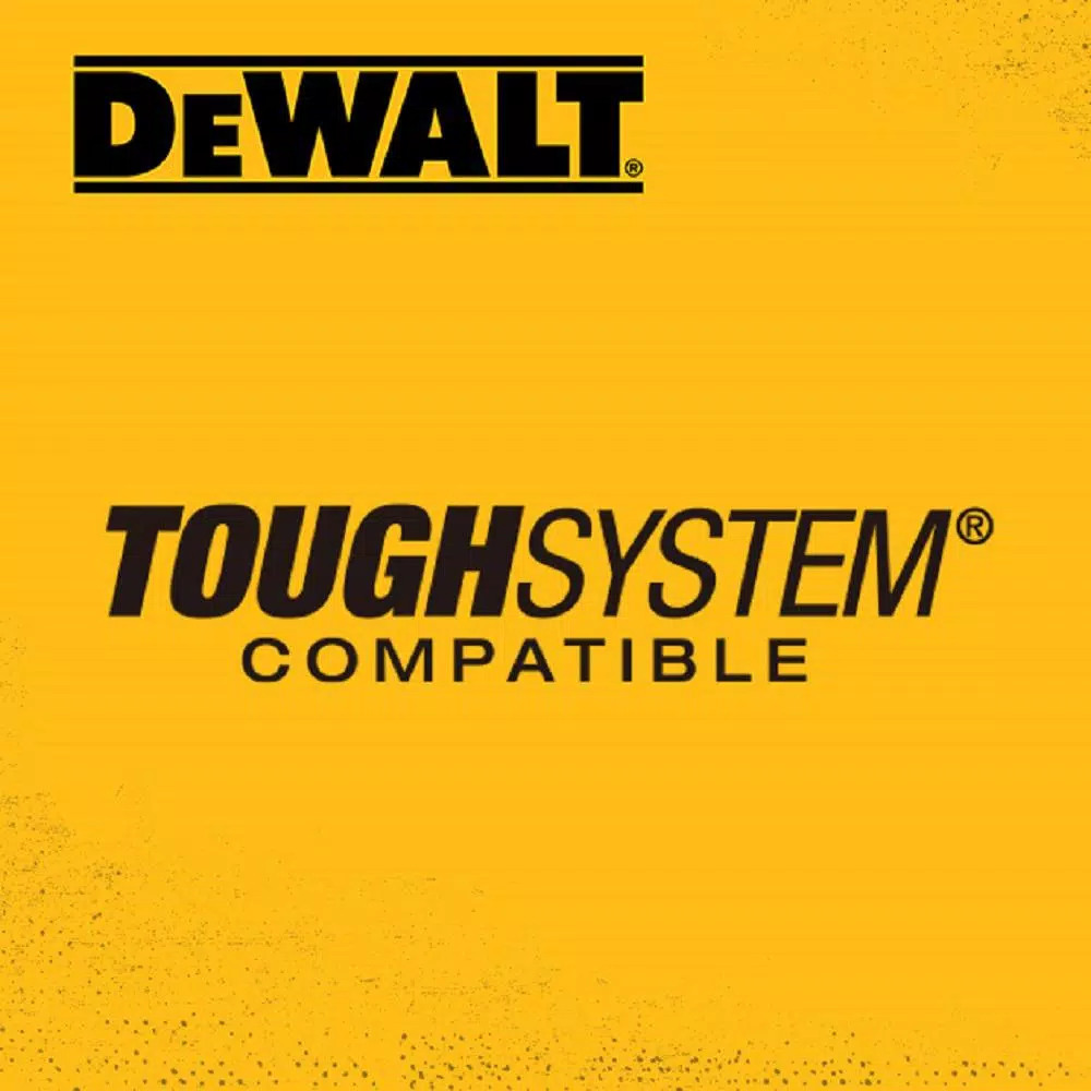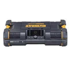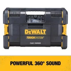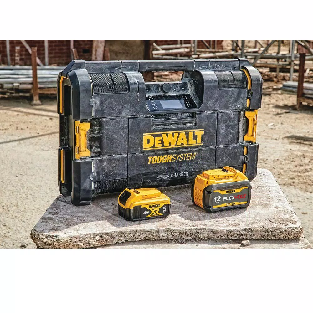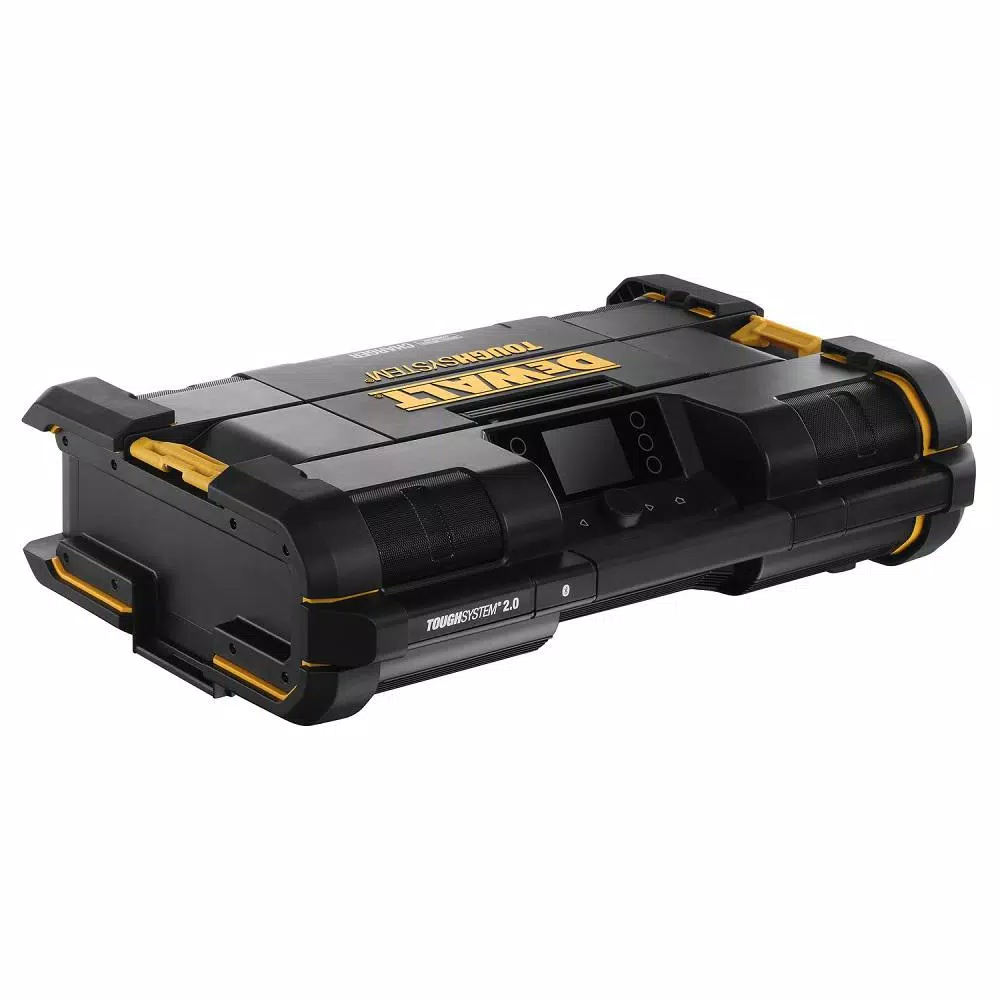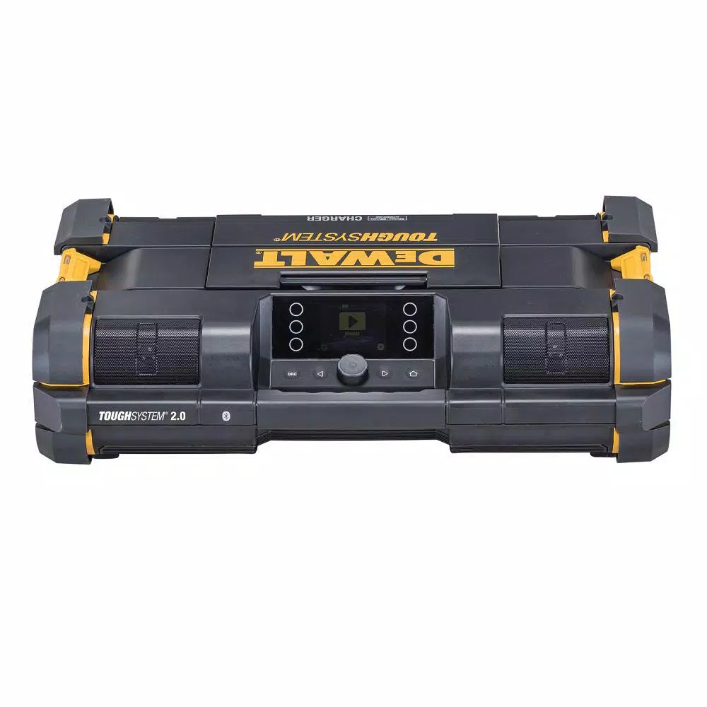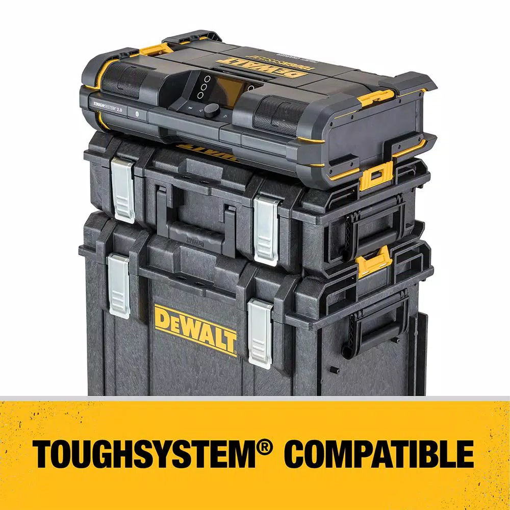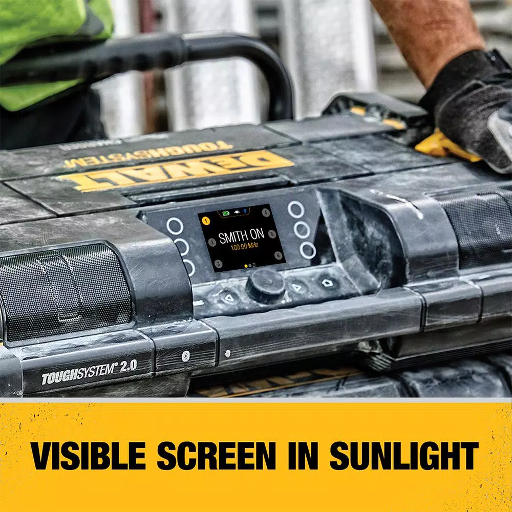Use the TOUGHSYSTEM 2.0 Radio and Charger Bluetooth wireless connection to stream music on the jobsite up to 100 ft. It has 5 full range speakers, an active sub-woofer and a passive bass resonator to create a loud and high-quality sound, accompanied by dynamic range control allowing sound to be adjusted between indoor and outdoor settings. This radio has a color LCD screen and touch-screen capabilities. With an IP54 dust and water resistance rating, this radio can be used in harsh jobsite conditions. Charge any device with the USB fast-charger and AUX ports and use DEWALT 12-Volt MAX, 20-Volt MAX or FLEXVOLT batteries for outstanding runtime. Compatible with any TOUGHSYSTEM Storage unit.