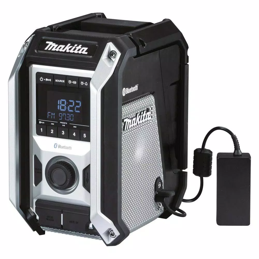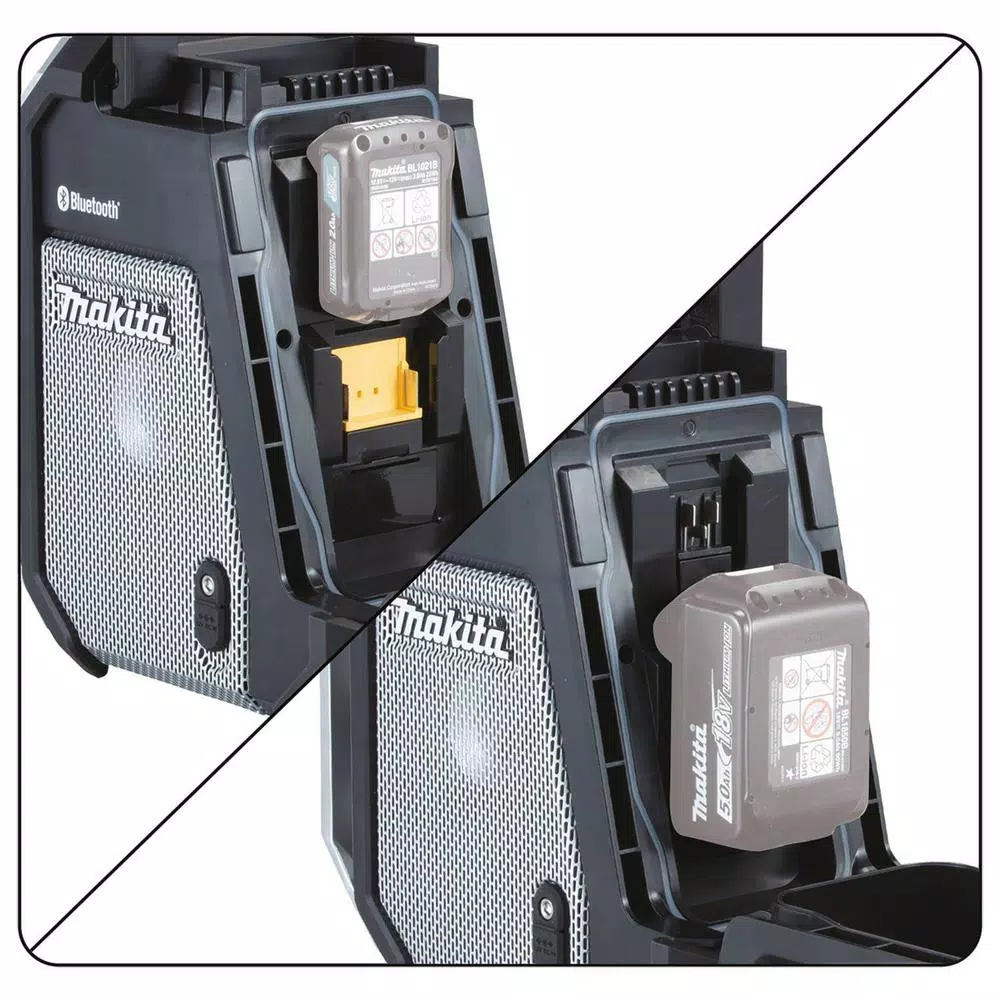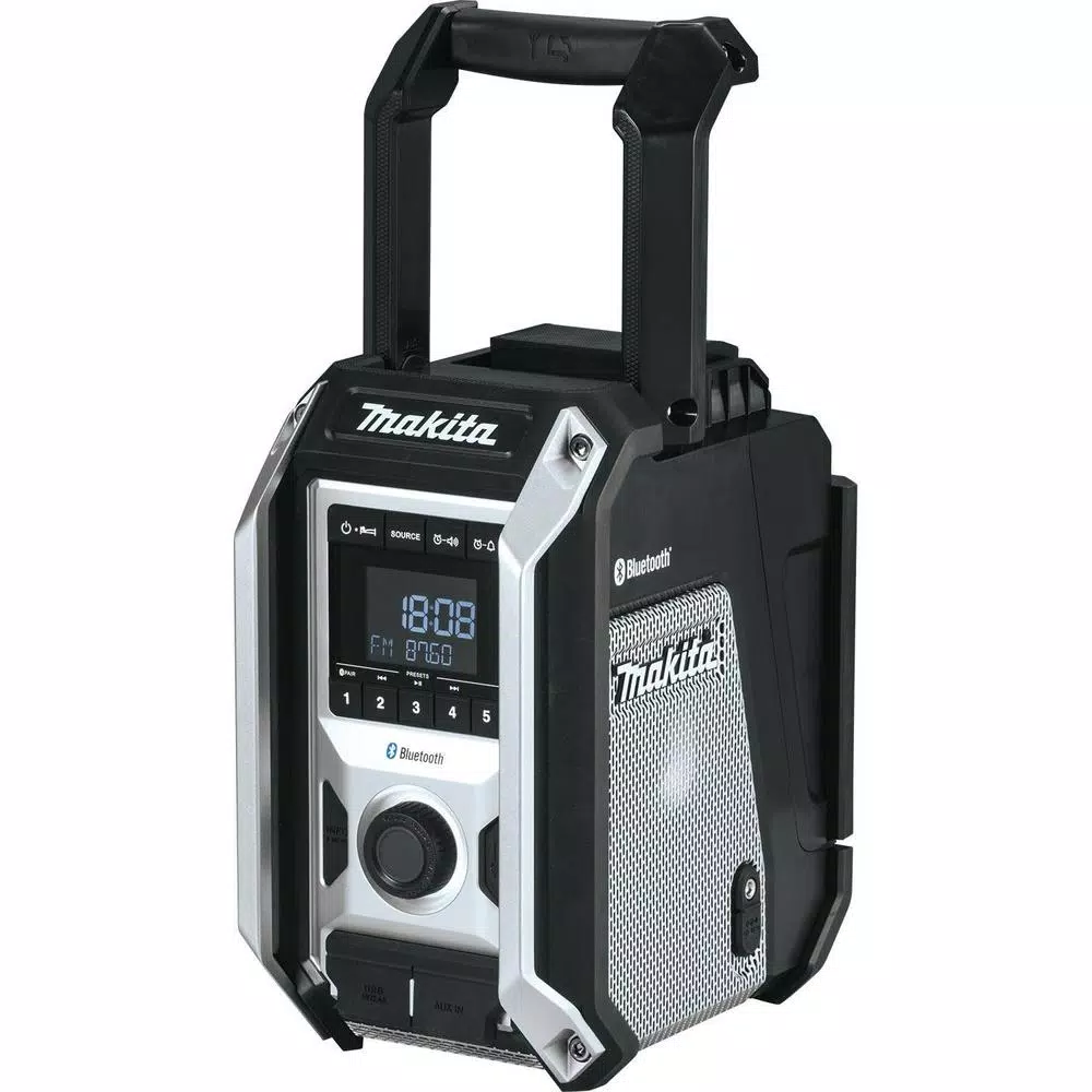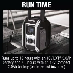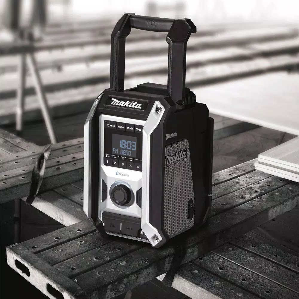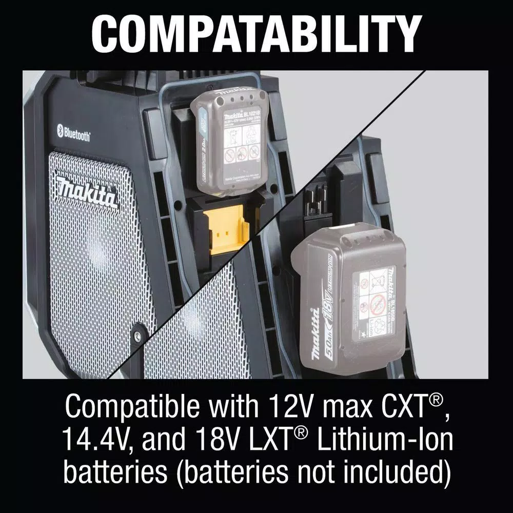 The Makita 18V LXT/12V max CXT Cordless Bluetooth Job Site Radio (XRM09B, tool only) delivers rich sound and increased compatibility in a more compact size. It is a perfect addition to the workshop or job site and comes in a black trade dress. The XRM09B delivers great sound in a compact size and is equipped with Bluetooth to wirelessly connect your mobile device to play music. It has 1 auxiliary port for MP3 compatibility and delivers rich stereo sound from 2 powerful 2.5 in. side-firing speakers. The XRM09B is engineered to stand up against harsh job site conditions with protective bumpers and features dust and water resistant construction (IP65 rated) for increased durability. The radio can be powered by Makita 12V MAX CXT, 14.4-Volt and 18V LXT Lithium-Ion Batteries (all sold separately). Makitaโs expanding 18V LXT system, the worlds largest cordless tool system powered by 18V lithium-ion batteries. Makita 18V Lithium-Ion Batteries have the fastest charge times in their categories, so they spend more time working and less time sitting on the charger. With Makita 12V MAX CXT Lithium-Ion Batteries, users get superior balance and ergonomics over pod-style batteries. The expanding 12V max CXT product line combines performance with superior ergonomics in a compact size.