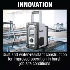 The 18-Volt LXT lithium-ion Job Site Radio (model XRM05W) delivers rich sound and increased compatibility in a more compact size. It is a perfect addition to the workshop or job site. Its part of Makita expanding 18-Volt Lithium-Ion system, the worlds largest cordless tool system powered by 18-Volt Lithium-Ion slide-style batteries. Makita 18-Volt Lithium-Ion batteries have the fastest charge times in their categories, so they spend more time working and less time sitting on the charger. The XRM05W is MP3 compatible for iPod and MP3 players and delivers rich stereo sound from 2 powerful 3 in. side-firing speakers. It is engineered to stand up against harsh job site conditions with protective bumpers and features dust and water resistant construction for increased durability. The radio can be powered by Makita 7.2-Volt, 12-Volt maximum, 12-Volt maximum CXT, 14.4-Volt and 18-Volt LXT lithium-ion batteries (all sold separately).
