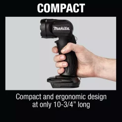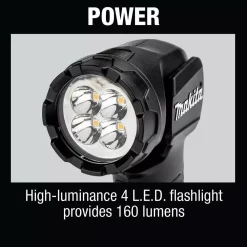 The Makita 18V LXT L.E.D. Flashlight (DML815B) delivers bright illumination, versatility and convenience with a distinctive black trade dress. The high-luminance 4 L.E.D. flashlight provides 160 lumens. The fast-charging Makita 18V LXT Lithium-Ion Battery delivers up to 23-hours of continuous illumination on a single charge (when using the 18V LXT Lithium-Ion 5.0Ah battery, sold separately). The 12-position aluminum pivoting head provides added versatility, with a durable design engineered for job site conditions. A metal hang-hook provides added convenience. The flashlight has a slim, compact design at 10-3/4 in. L and weighs only 1.95 lbs. (with 18V LXT battery, sold separately). Itβs part of Makitaβs expanding 18V LXT system, the worldβs largest cordless tool system powered by 18V lithium-ion batteries. Makita 18V LXT Lithium-Ion Batteries have the fastest charge times in their categories, so they spend more time working and less time sitting on the charger.
