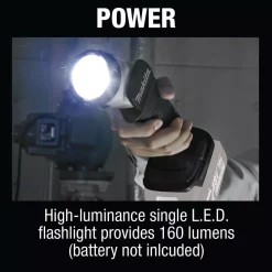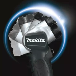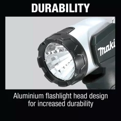 The 18-Volt LXT Lithium-Ion L.E.D. Flashlight (model DML802) delivers bright illumination, versatility, and convenience. The high-luminance single LED flashlight provides 160 Lumens. The fast-charging 18-Volt LXT Lithium-Ion battery delivers up to 23 hours of continuous illumination on a single charge (when using the 18-Volt LXT Lithium-Ion 5.0Ah battery, sold separately). The Flashlight can be powered by Makita 18-Volt Lithium-Ion batteries. The 12-position aluminum pivoting head provides added versatility, with a durable design engineered for job site conditions. A metal hang-hook provides added convenience. The flashlight has a slim, compact design at 10-3/4L and weighs only 2.1 lbs. (with 18-Volt LXT battery, sold separately). Its part of Makita’s expanding 18-Volt Lithium-Ion system, the world’s largest cordless tool system powered by 18-Volt Lithium-Ion slide-style batteries. Makita 18-Volt Lithium-Ion batteries have the fastest charge times in their categories, so they spend more time working and less time sitting on the charger.