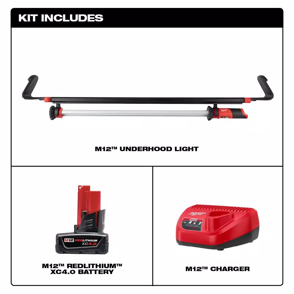- Includes: (1) 2125 M12 Underhood Light, (1) 48-11-2440 M12 REDLITHIUM XC4.0 Battery Pack, (1) 48-59-2401 M12 Battery Charger