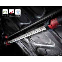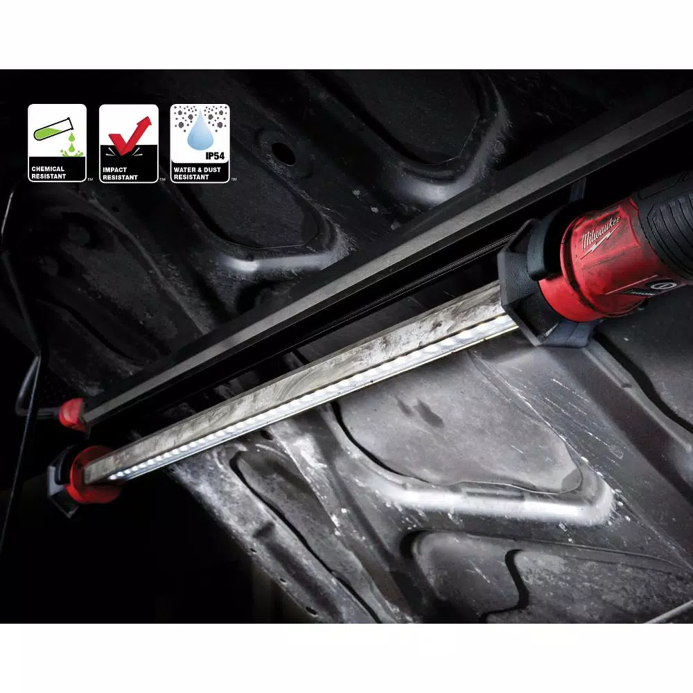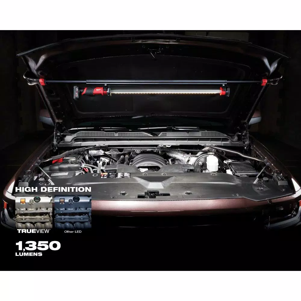 The Milwaukee M12 Underhood Light Shines Brighter, Grips Stronger, and Protects Longer. The LED underhood work light delivers 1350 Lumens of TRUEVIEW High Definition Output for full engine coverage and clarity. FINISHGUARD hooks resist wear, providing long-lasting protection against scratches to a vehicleโs finish. The LED light bar features 2x more gripping surface to help users get more contact for better positioning when mounting under hood, undercarriage or elsewhere. The under hood light bar can rotate, slide, remove and hang for added flexibility and versatility, perfect for mechanics working in automotive shops or fleet maintenance. The carrier extends 47 in.-78 in. to fit wide cars and trucks. The LED underhood light delivers up to 8 hours of runtime when powered by an M12 REDLITHIUM XC4.0 Battery Pack. This light is impact and chemical resistant, built to withstand the toughest environments. The high-quality LEDs never need to be replaced and are backed by a limited lifetime warranty. The kit includes the light bar, one M12 REDLITHIUM XC4.0 battery and one M12 lithium-ion battery charger.