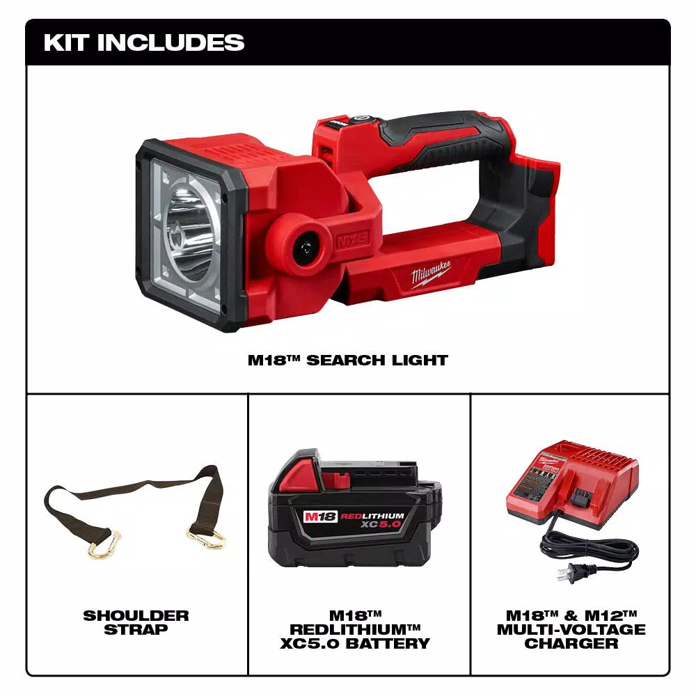 - Includes: (1) 2354-20 M18 Search Light, (1) 48-11-1850 M18 REDLITHIUM XC5.0 Extended Capacity Battery Pack, (1) 48-59-1812 M18 & M12 Multi-Voltage Charger, (1) Shoulder Strap