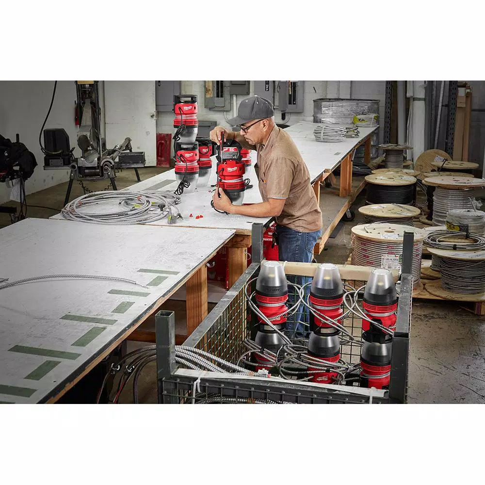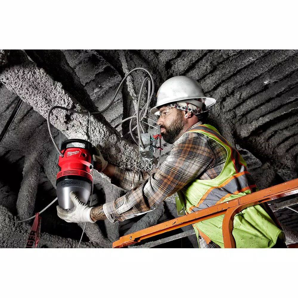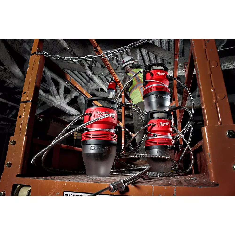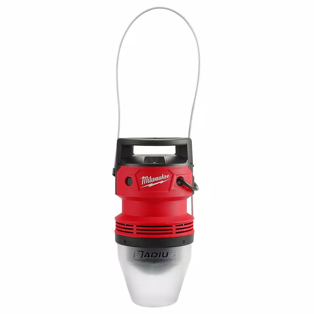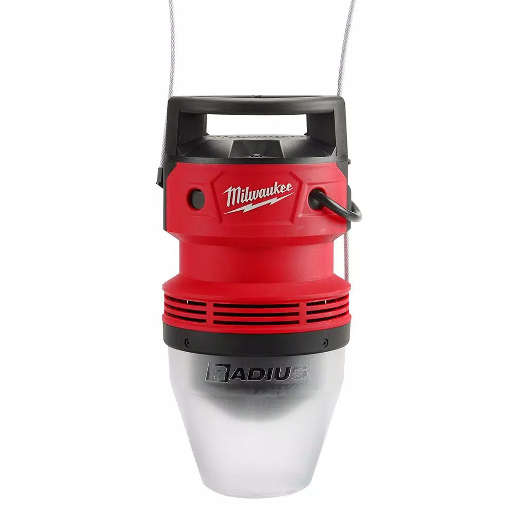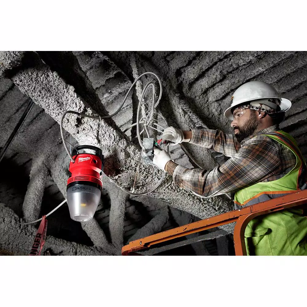 The MILWAUKEE RADIUS LED 70w Temporary Site Light brings a new level of innovation to the temporary lighting process for easy setup, instant light, and no maintenance. This 70-watt temporary site light with improved durability can be used in many construction environments from residential to large scale commercial jobs. Temporary job site light includes a standard 120v plug, and in large applications these site lights can be wired together with Non-Metallic (NM-B) or MC Cable for integration into temporary power systems from 120 to 277 volts. Once wired, the installation time is drastically improved with an integrated hang cable and a spring loaded cable retention to ensure the light is secure once installed. The 70w temporary site light delivers 7,700 lumens and is 30% more efficient than a 105w fluorescent, significantly outlasting HID competitors. Fewer circuits are needed for this temporary jobsite lighting, lowering overall power costs to save users time and money. The LEDs never need to be replaced and are backed by a limited lifetime warranty. Milwaukee RADIUS Site Lights provide maximum coverage for task, area, or overhead applications with their ability to fill an entire workspace with 360 degrees of light.
