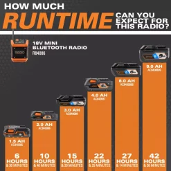 - Includes: (1) R84086 18-Volt Mini Bluetooth Radio with Radio App, (2) AAA batteries, (1) auxiliary cable, (1) AC840086 2.0 Ah Lithium-Ion Battery, (1) R86092 18-Volt Charger, and operatorโs manuals